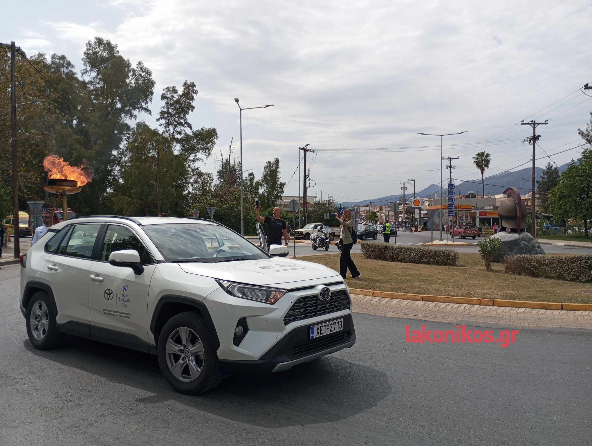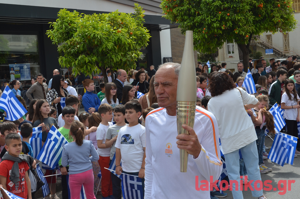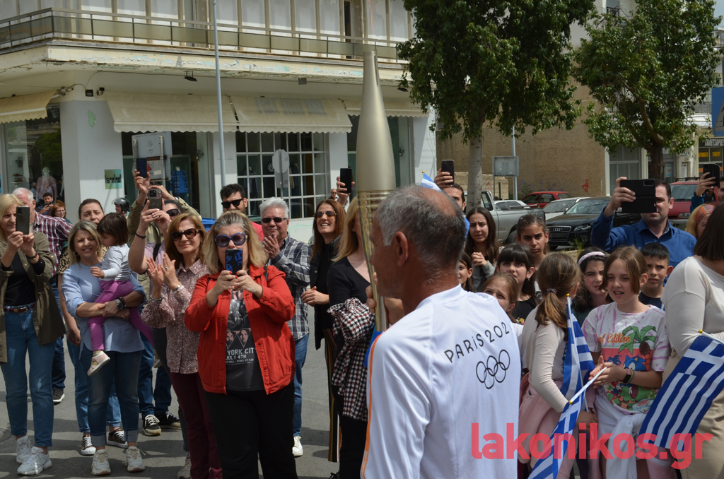 Προερχόμενη από τη Μεσσηνία, όπου διανυκτέρευσε την πρώτη ημέρα της πομπής, η Φλόγα έλαβε εκκίνηση για τη λαμπαδηδρομία από τον κυκλικό κόμβο της Κ. Παλαιολόγου, σε μια Σπάρτη που είχε βάλει τα επίσημά της. Ο λαμπαδηδρόμος ο οποίος εισόδευσε το Ολυμπιακό Φως στην πόλη, ήταν ο Καθηγητής του Τμήματος Οργάνωσης και Διαχείρισης Αθλητισμού του Πανεπιστημίου Πελοποννήσου, Αθανάσιος Στρίγκας. Ακολούθως, τρεις Σπαρταθλητές, ο εμβληματικός Γιάννης Κούρος, καθώς και οι Λάκωνες Γιώργος Κουλόγιαννης και Τάσος Τσουλόγιαννης ήταν εκείνοι στους οποίους ανατέθηκε η εξαιρετική τιμή να κρατήσουν τη δάδα και να διαχύσουν το Φως στη «ραχοκοκαλιά» της Σπάρτης. Σε όλη τη διαδρομή, δεκάδες εκατοντάδες παιδιά-μαθητές σχολείων και ενήλικες, κρατώντας ελληνικές σημαίες, ήταν παρατεταγμένοι κατά μήκος της Κ. Παλαιολόγου, επιφυλάσσοντας ένθερμη υποδοχή στη Φλόγα και αποθέωση στους κομιστές του Φωτός.