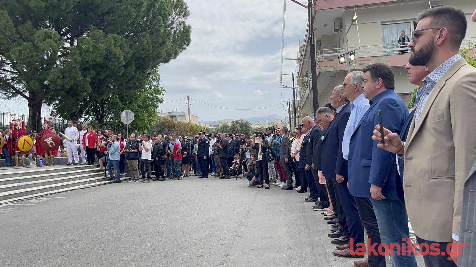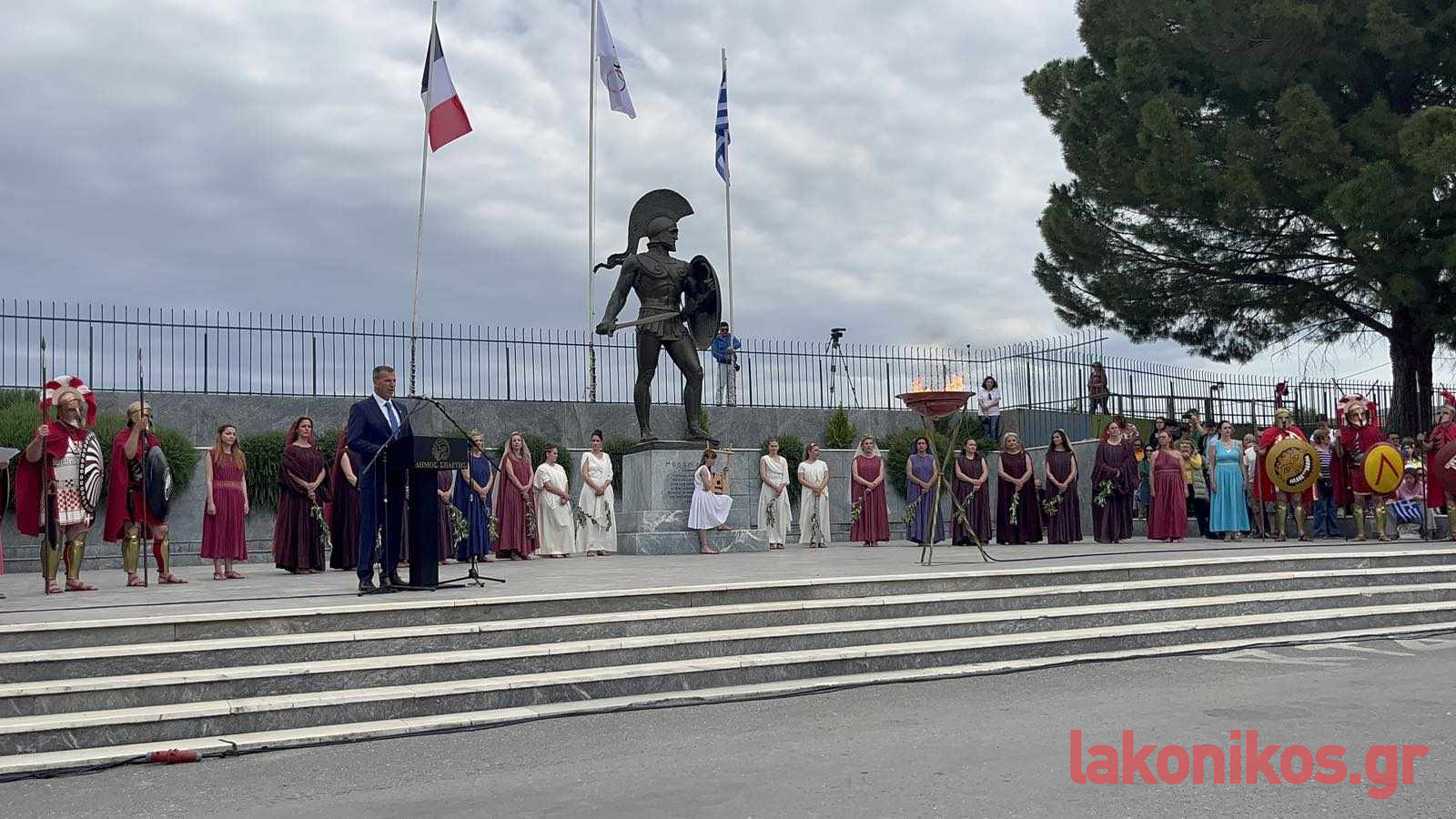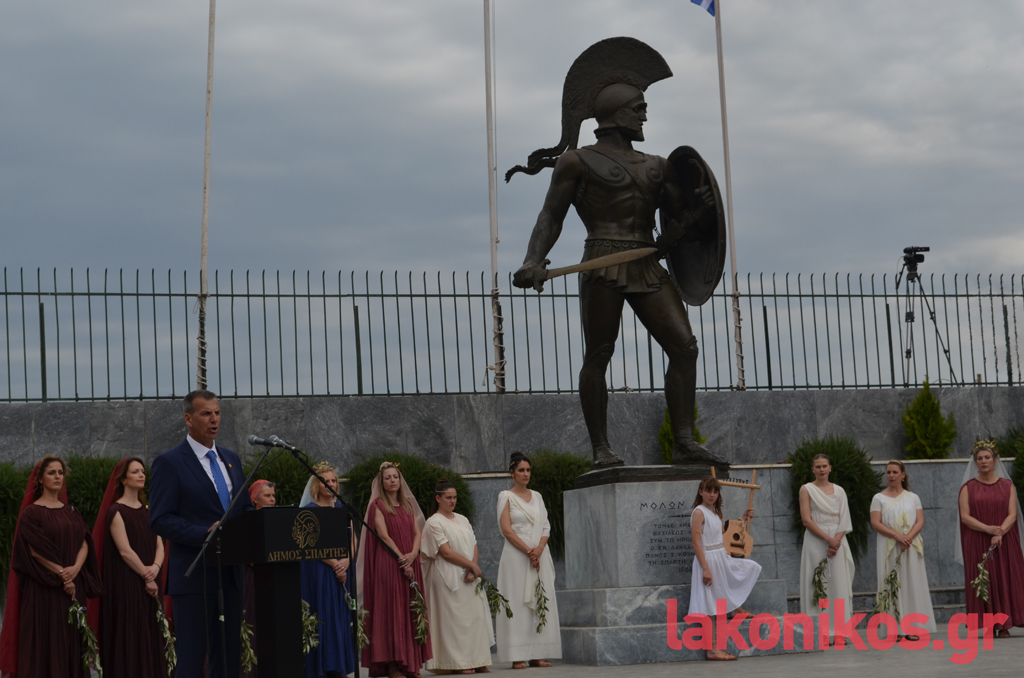 Ο δήμαρχος Σπάρτης, Μιχάλης Βακαλόπουλος, στον χαιρετισμό του καλωσόρισε τους υψηλούς προσκεκλημένους, κάνοντας λόγο για «τη Σπάρτη, την προστάτιδα του Ολυμπισμού και του Ολυμπιακού Ιδεώδους. Πριν από 2.800 χρόνια, ο μεγαλύτερος νομοθέτης του αρχαίου κόσμου, ο Λυκούργος, μαζί με τους βασιλείς της Ήλιδας, Οινόμαο, και Πίσας, Κλεοσθένη, χάραξαν στον δίσκο το ιερό κείμενο της Εκεχειρίας, καθιερώνοντας έτσι το μακροβιότερο σύμβολο Ειρήνης στον αρχαίο κόσμο». Παρατήρησε πως «η έλευση της Φλόγας στη Σπάρτη αποτελεί έμπρακτη αναγνώριση του ιστορικού και πολιτισμικού ρόλου της πόλης μας». «Ένα από τα σημαντικότερα σύμβολα του Ολυμπιακού Κινήματος, με οικουμενική απήχηση, η Φλόγα, βρίσκεται σήμερα εδώ», είπε και συνέχισε: «Και από αυτό το σημείο, το άγαλμα του Λεωνίδα, στέλνουμε σε όλο τον κόσμο το μήνυμα της Ειρήνης. Ειδικά σε μια περίοδο που μαίνονται στον γεωπολιτικό μας χώρο και γειτονιά, συγκρούσεις, οι οποίες μάς ανησυχούν όλους. Στόχος μας είναι να μπολιάσουμε τους νέους με το δέντρο της ειρήνης και της ελπίδας. Να μεταδώσουμε τη δύναμη των αξιών του τόπου μας σε κάθε γωνιά του πλανήτη. Το Ολυμπιακό Ιδεώδες, την πίστη στην αξία του Ανθρώπου, τον σεβασμό στον αντίπαλο, το Ευ Αγωνίζεσθαι, τη συναδέλφωση των λαών και τη διεθνή Ειρήνη». Πλέκοντας το εγκώμιο όλων των συντελεστών, μεταξύ άλλων, επεσήμανε ότι «είμαστε σίγουροι ότι οι φετινοί Ολυμπιακοί Αγώνες στο Παρίσι θα στεφθούν με επιτυχία».
