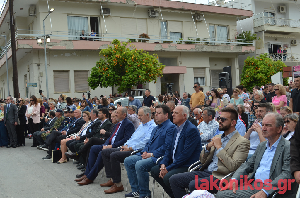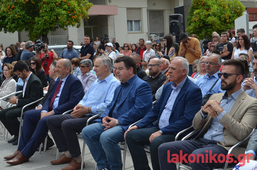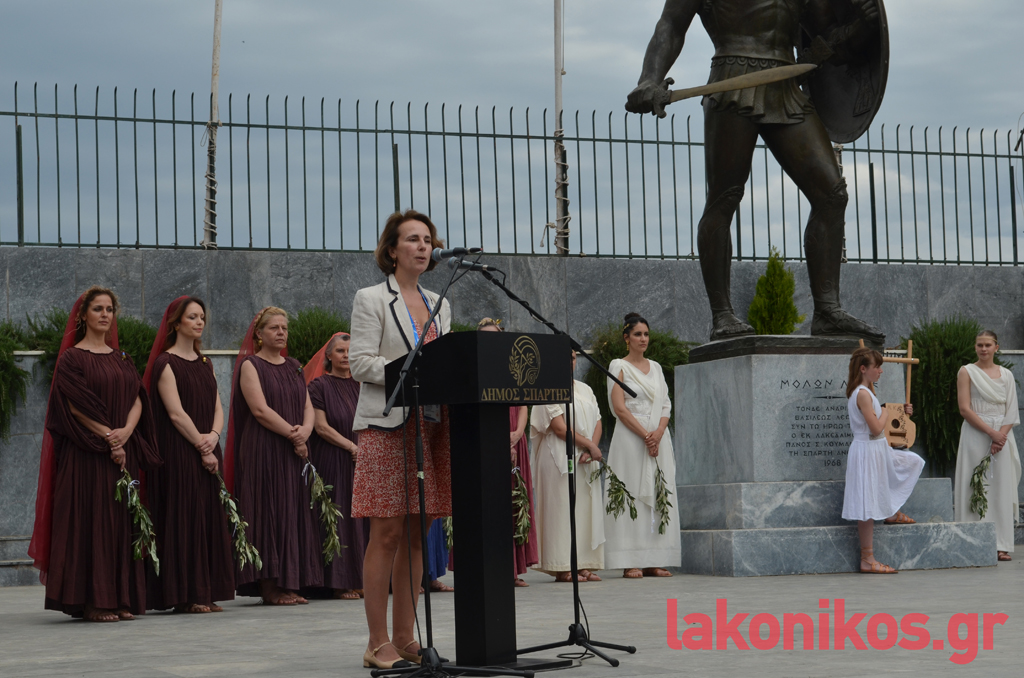 Ακολούθησε μια δωρική και απέριττη τελετή που είχε ετοιμάσει ο Δήμος Σπάρτης, η οποία ξεκίνησε με ανάκρουση του Ολυμπιακού Ύμνου, του Εθνικού Ύμνου της Γαλλίας και του Εθνικού Ύμνου της Ελλάδας, με ταυτόχρονη έπαρση των τριών σημαιών.