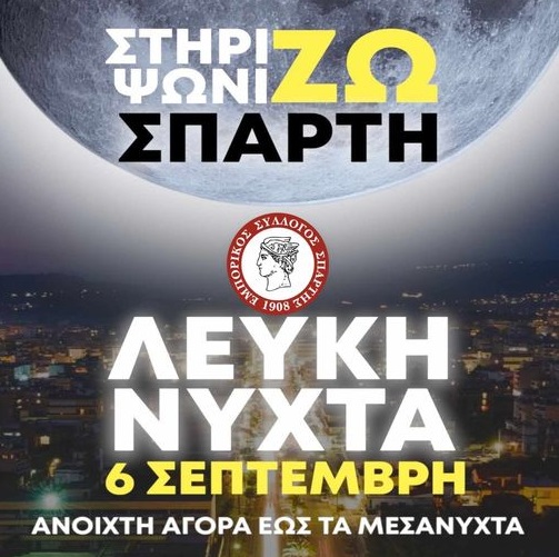 Με μότο «Στηρίζω, ψωνίζω, Σπάρτη», προχωρά στη διεξαγωγή της «Λεύκης Νύχτας» ο Εμπορικός Σύλλογος Σπάρτης, την Παρασκευή 6 Σεπτεμβρίου στη λακωνική πρωτεύουσα. Για τους θιασώτες τού θεσμού, είτε αυτοί είναι δημότες-καταναλωτές που θέλουν να προγραμματίσουν τις αγορές τους είτε πολίτες που έλκονται από το εορταστικό της ατμόσφαιρας, αλλά και για κάποιους επαγγελματίες, η φθινοπωρινή διεξαγωγή της εκδήλωσης υπήρξε μια μικρή έκπληξη. Άλλωστε, όλο το προηγούμενο διάστημα, ο Αύγουστος ήταν ο μήνας της «Λευκής Νύχτας».