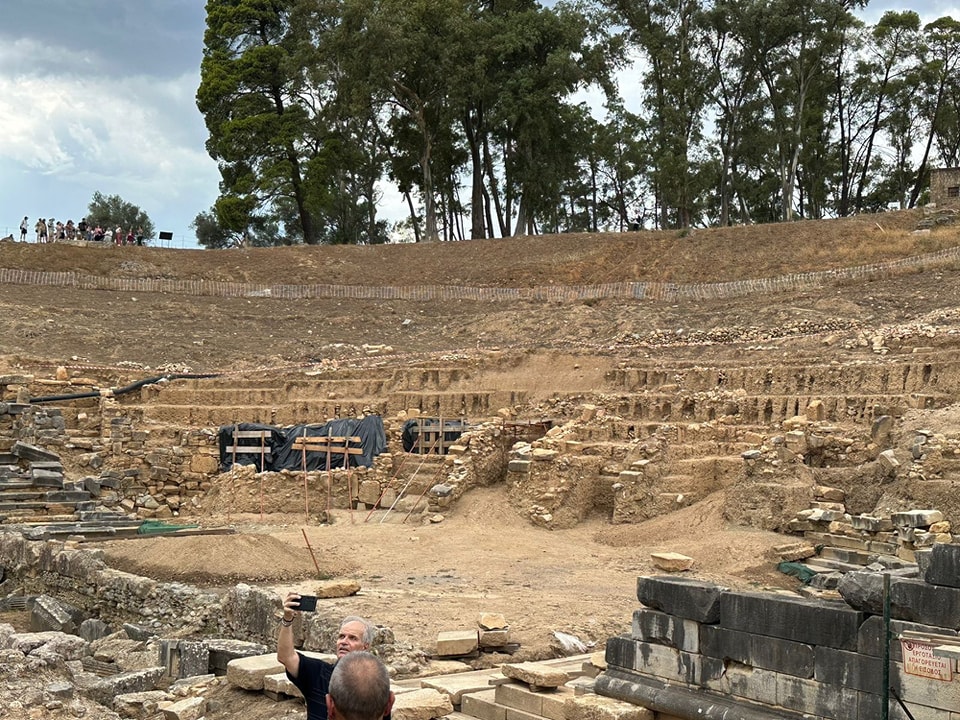 Στο Αρχαίο Θέατρο, η Λ. Μενδώνη επιθεώρησε τις εργασίες αποκατάστασής του, ενώ ενημερώθηκε από την προϊσταμένη του Τμήματος Προϊστορικών & Κλασσικών Αρχαιοτήτων της ΕΦΑΛΑΚ, Μαρία Τσούλη. Η υπουργός προέβη σε επισημάνσεις για την τροποποίηση της περιγραφής του φυσικού αντικειμένου του έργου, για το οποίο δήλωσε πως δύναται να ολοκληρωθεί έως τα τέλη του 2025. Πηγές μετέφεραν, πάντως, στον «ΛΤ, πως η υπουργός δεν έκρυψε την αμηχανία της στη θέα της σημερινής κατάστασης του χώρου.