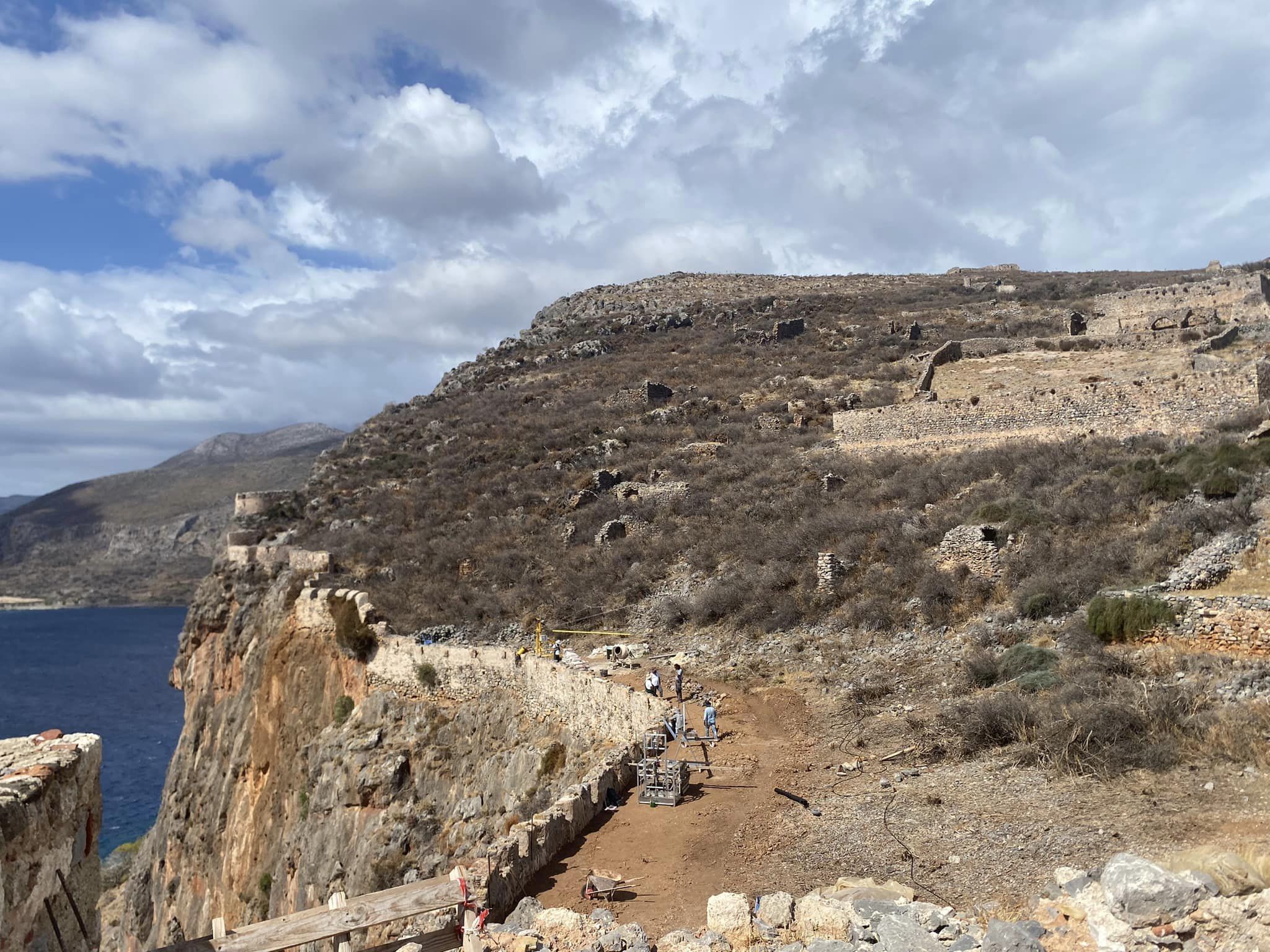 Εν τω μεταξύ, σε πλήρη πρόοδο βρίσκεται και η εκτέλεση του έργου συντήρησης των τειχών στην άνω πόλη, στα σημεία που θα βρίσκονται οι γραμμές τού τελεφερίκ, μήκους 55 μέτρων περίπου, συνολικού προϋπολογισμού 325.000€ (+ΦΠΑ).