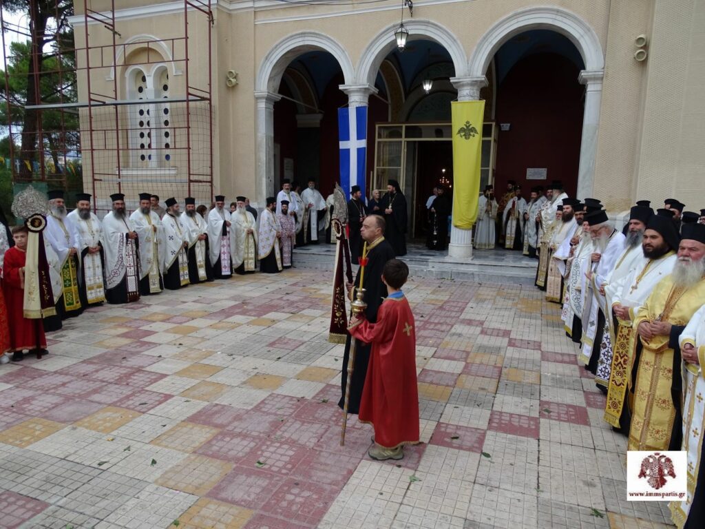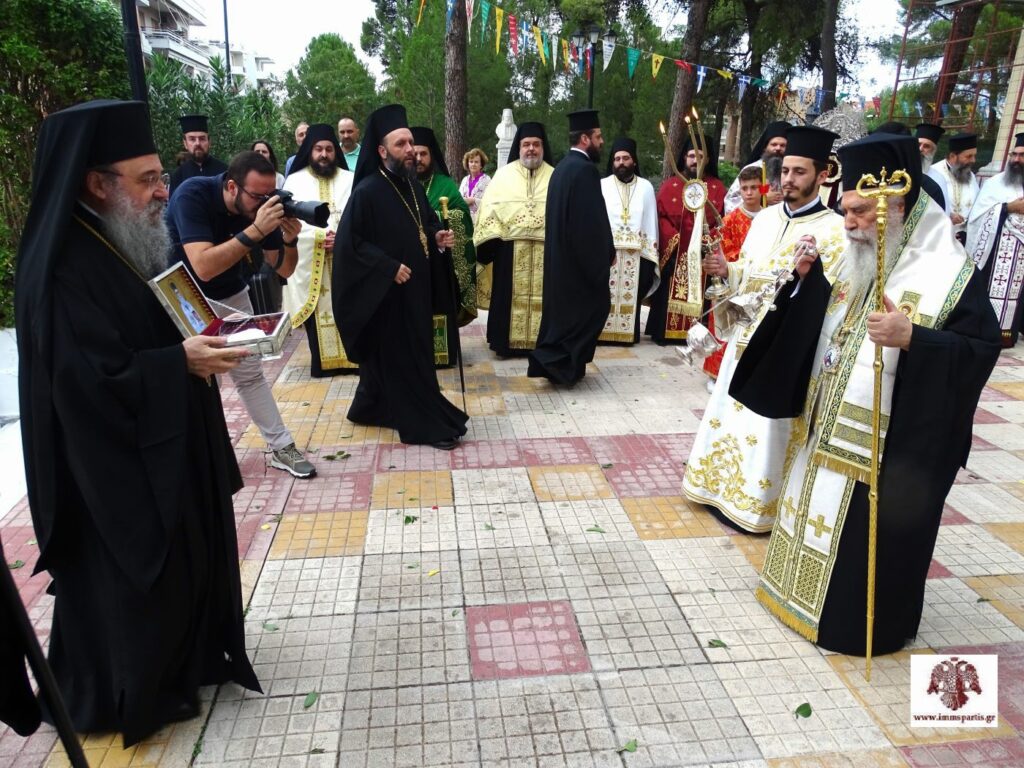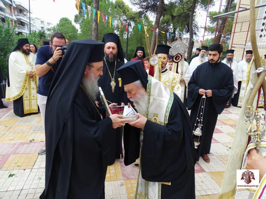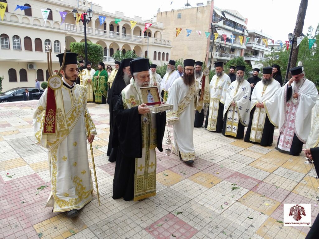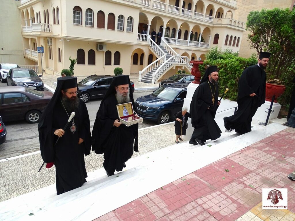Πριν την πανηγυρική εσπερινή λατρευτική σύναξη, πραγματοποιήθηκε, με την πρέπουσα εκκλησιαστική λαμπρότητα και σε κλίμα κατάνυξης, η υποδοχή αποτμήματος του ιερού λειψάνου του προσφάτως αγιοκαταχθέντος Αγίου Γερβασίου του εκ Πατρών, το οποίο πρόσφερε στην τοπική Εκκλησία ο σεβασμιώτατος Μητροπολίτης Πατρών κ. Χρυσόστομος.