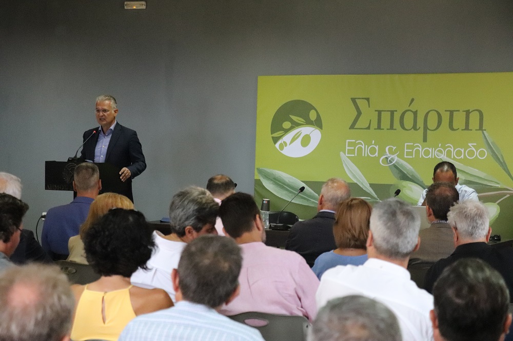 Ακολούθως, στο βήμα ανέβηκε ο Λάκωνας γενικός γραμματέας τού Υπουργείου Αγροτικής Ανάπτυξης και Τροφίμων (ΥπΑΑΤ), Γιώργος Στρατάκος, ο οποίος ανέπτυξε την πολιτική της κυβέρνησης για την ενίσχυση της ελαιοπαραγωγής. Χαρακτηρίζοντας το ελαιόλαδο «θησαυρό» τού τόπου, υπογράμμισε ότι «στη Λακωνία παράγεται ένα από τα πιο εκλεκτά ελαιόλαδα της Ελλάδας. Κοινή επιδίωξη, επεσήμανε, είναι «η ανάδειξη του πρωταγωνιστικού ρόλου τού ελαιοκομικού τομέα, η διασύνδεσή του με την επιστημονική έρευνα, η καινοτομία, η συνεργασία και η εξωστρέφεια». Υπογράμμισε δε, ότι «στο ΥπΑΑΤ εργαζόμαστε με συνέπεια και μεθοδικότητα, εφαρμόζοντας μια στρατηγική με σαφείς στόχους και συγκεκριμένα χρονοδιαγράμματα». Κύριος σκοπός είναι η προστασία της ελαιοκαλλιέργειας, η διευκόλυνση των παραγωγών στις προκλήσεις που αντιμετωπίζουν και η ενίσχυση της προώθησης των ελαιοκομικών προϊόντων στις αγορές. «Εκμεταλλευόμαστε κάθε ευκαιρία, για να καταστήσουμε τα ελληνικά προϊόντα, ανταγωνιστικά, αλλά και ως σύμβολα ποιότητας σε παγκόσμιο επίπεδο». Στάθηκε ιδιαίτερα στην επένδυση στην επιστημονική έρευνα και την επιστημονική τεκμηρίωση, καθώς «αποτελούν θεμελιώδεις προϋποθέσεις για την παραγωγή προϊόντων υψηλής ποιότητας και διατροφικής αξίας, ώστε να αποκτήσουν προστιθέμενη αξία και να συμβάλλουν στην ενίσχυση του εισοδήματος των παραγωγών».