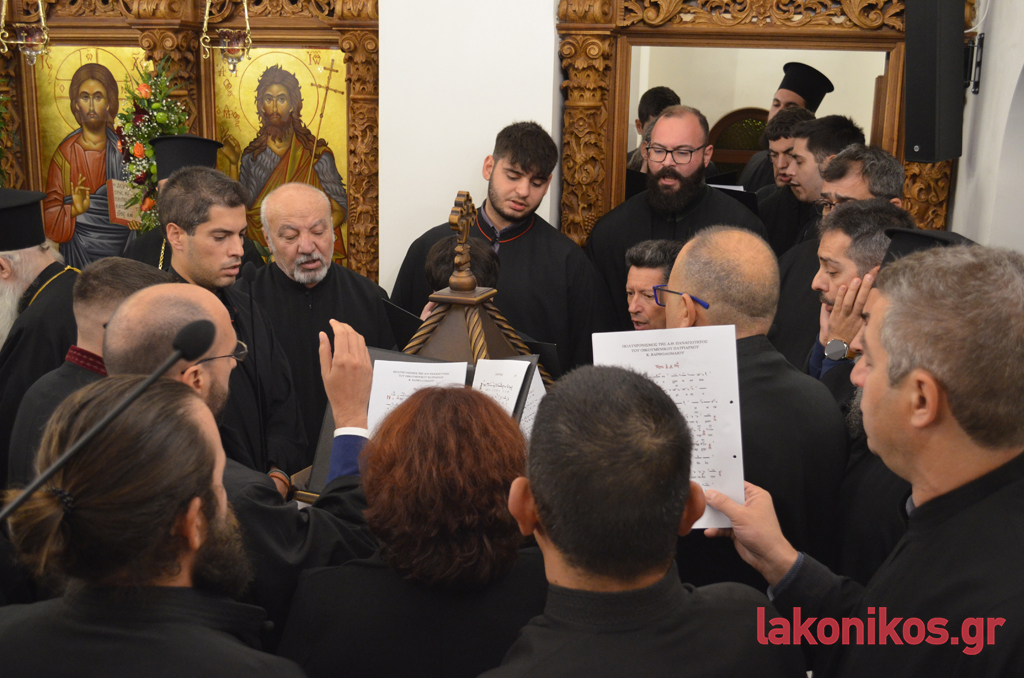 Τους ύμνους κατά τη διάρκεια της τελετής απέδωσε άριστα η χορωδία τής Σχολής Βυζαντινής Μουσικής «Πέτρος ο Λακεδαιμόνιος» τής ΙΜΜΣ, υπό τον υπεύθυνο της Σχολής και πρωτοψάλτη του Μητροπολιτικού Ναού Σπάρτης, Παναγιώτη Χρόνη.