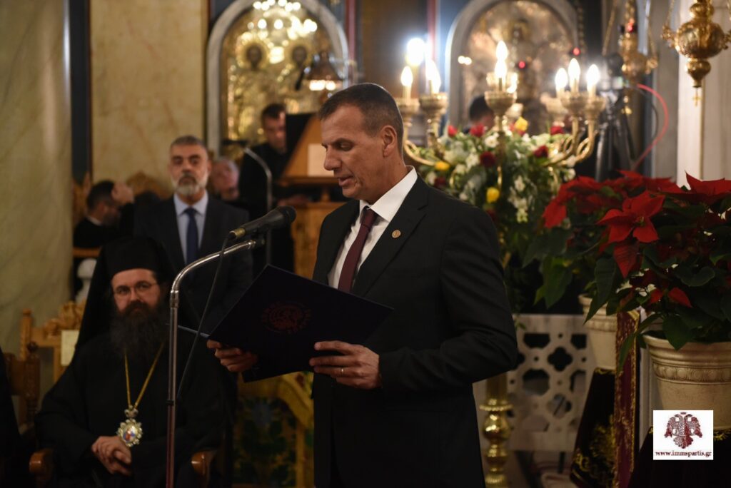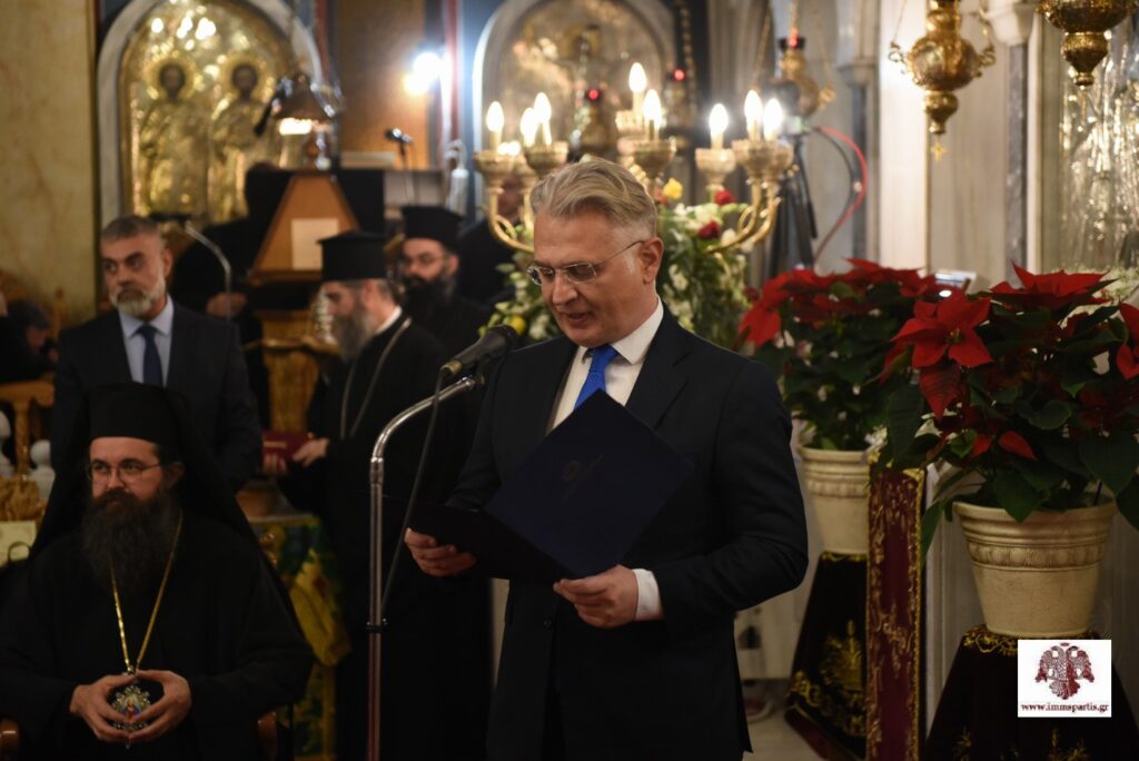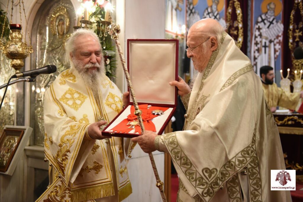 Πριν την μετάληψη των Αχράντων Μυστηρίων, ο Μητροπολίτης Ευστάθιος απευθύνθηκε στον Οικουμενικό Πατριάρχη και στο πυκνό εκκλησίασμα, αναφερόμενος αρχικά στον τιμώμενο Όσιο Νίκωνα τον «Μετανοείτε», «ο οποίος επί δέκα και πλέον αιώνες προστατεύει τη Λακεδαίμονα και ευεργετεί τους κατοίκους της». Ακολούθως, απένειμε στον Παναγιώτατο, την ανώτατη τιμητική διάκριση της Ιεράς Μητρόπολης Μονεμβασίας και Σπάρτης, τον Μεγαλόσταυρο της Χιλιετηρίδος τού Οσίου Νίκωνος, τιμώντας επαξίως στο πρόσωπό του, «το αυθεντικό εκκλησιαστικό ήθος, την εδραία προσήλωση στις ελληνοχριστιανικές παραδόσεις, τη θυσιαστική του αγάπη προς τη Θεόδμητη Μεγάλη τού Χριστού Εκκλησία και την εν γένει ορθή μαρτυρία τής Ορθοδόξου Πίστεως». Ο σεπτός ποιμενάρχης κ. Ευστάθιος ευχήθηκε στον κκ Βαρθολομαίο, «υγεία και μακροημέρευση, ώστε να συνεχίσει απρόσκοπτα την πολύπτυχη, πολύτιμη και πολυεύθυνη Πατριαρχική διακονία του, προς οικοδομή τού Σώματος του Χριστού, εύκλεια τού Σκάφους της Εκκλησίας και δόξα τού Παναγίου Ονόματος του Δομήτορος Αυτής».