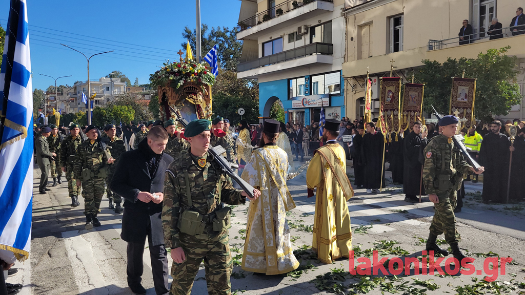 Κατά τον εορτασμό παρέστησαν, μεταξύ άλλων, η υφυπουργός Παιδείας, Θρησκευμάτων & Αθλητισμού, Ζέττα Μακρή, ως εκπρόσωπος του προέδρου της ελληνικής κυβέρνησης, οι τρεις βουλευτές Λακωνίας και βουλευτές όμορων νομών, ο περιφερειάρχης Πελοποννήσου, Δημήτρης Πτωχός, οι αντιπεριφερειάρχες Θοδωρής Βερούτης, Σπύρος Τζινιέρης και Θάνος Μιχελόγγονας και άλλοι, δήμαρχοι της Λακωνίας και γειτονικών περιοχών. Ακόμα, ο διοικητής ΔΙΚΕ Πελοποννήσου, Υποστράτηγος Απόστολος Τσουλουβής, ο Αστυνομικός Διευθυντής Λακωνίας, Βασίλειος Τσιγαρίδης, εκπρόσωποι των λοιπών Σωμάτων Ασφαλείας, μέλη της Αυτοδιοίκησης Α΄ και Β΄ Βαθμού, στελέχη τού Δικαστικού κλάδου, εκπρόσωποι όλων των βαθμίδων τής Εκπαίδευσης, φορέων και συλλόγων.