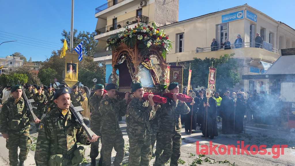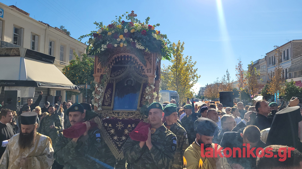 Αμέσως μετά, σε ατμόσφαιρα κατάνυξης, υπό τους παιανισμούς τής Φιλαρμονικής τού Δήμου Σπάρτης και με τη συνοδεία τιμητικού στρατιωτικού αγήματος, έγινε η λιτάνευση της ιερής εικόνας του Οσίου Νίκωνος του «Μετανοείτε» στο κέντρο της λακωνικής πρωτεύουσας. Στη λιτανευτική πομπή επί της Λεωφ. Λυκούργου, συμμετείχαν ο Παναγιώτατος, οι αρχιερείς, ιερείς τής τοπικής Εκκλησίας, μαθητές και μαθήτριες των σχολείων της πόλης με τη συνοδεία εκπαιδευτικών τους, καθώς και πολιτιστικοί σύλλογοι της περιοχής. Καθ’ όλη τη διάρκεια της περιφοράς τής εικόνας τού Αγίου, με ενθουσιώδεις αντιδράσεις, ο κόσμος εκδήλωνε τον σεβασμό και την αγάπη του προς το πρόσωπο του Πατριάρχη.
