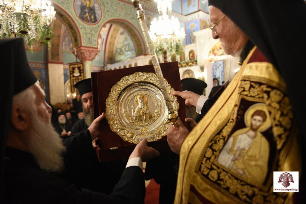 Ο κκ Βαρθολομαίος χάρισε στον σεβασμιώτατο κ. Ευστάθιο ένα Ιερό Ευαγγέλιο για τον ΙΝ Οσίου Νίκωνος, το οποίο είναι αντίγραφο Ευαγγελίου αποθησαυρισμένου στο Πατριαρχικό θησαυροφυλάκιο, καθώς κι ένα σετ αργυρών δισκαρίων. Επίσης, προσέφερε ως ευλογία, από ένα εγκόλπιο στους κκ Ευστάθιο και Θεόφιλο, όπως κι έναν Σταυρό τής Αγίας και Μεγάλης Οικουμενικής Συνόδου τής Κρήτης, στον εφημέριο τού ναού π. Αθανάσιο Σπηλιώτη.
