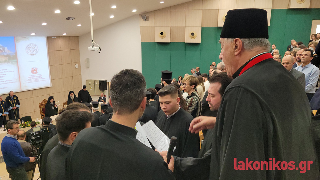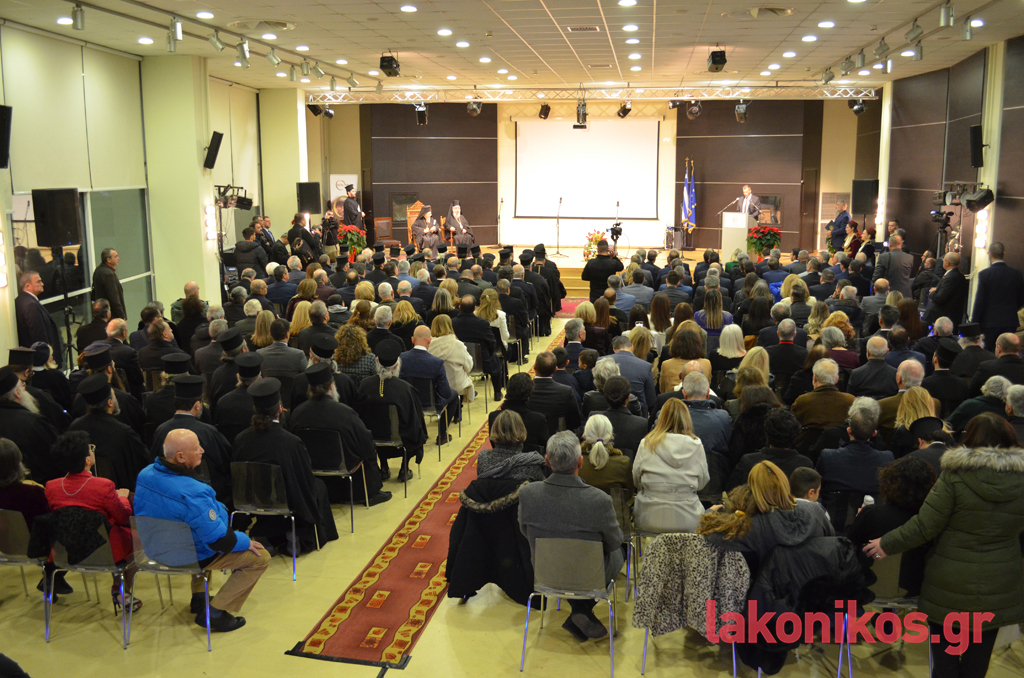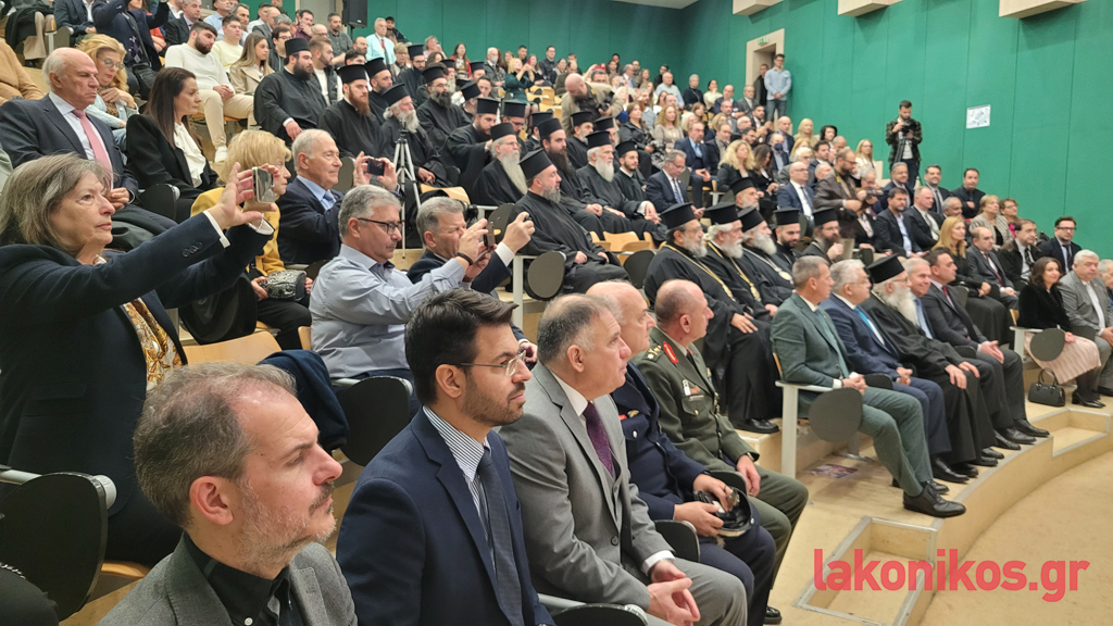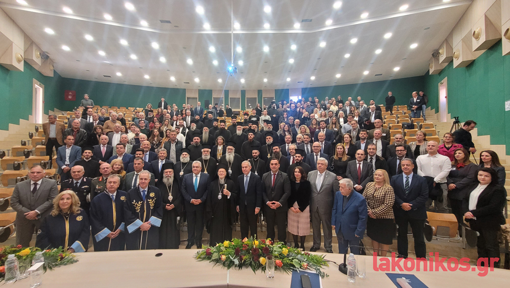 Εν συνεχεία, στην ασφυκτικά γεμάτη αίθουσα «Λακώνων ποιητών Γιάννη Ρίτσου & Νικηφόρου Βρεττάκου», έλαβε χώρα η τελετή ανακήρυξης του Οικουμενικού Πατριάρχη σε Επίτιμο Δημότη τού Δήμου Σπάρτης.