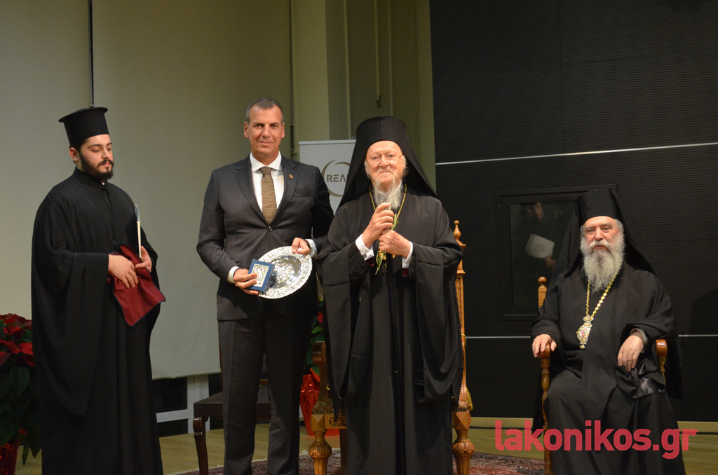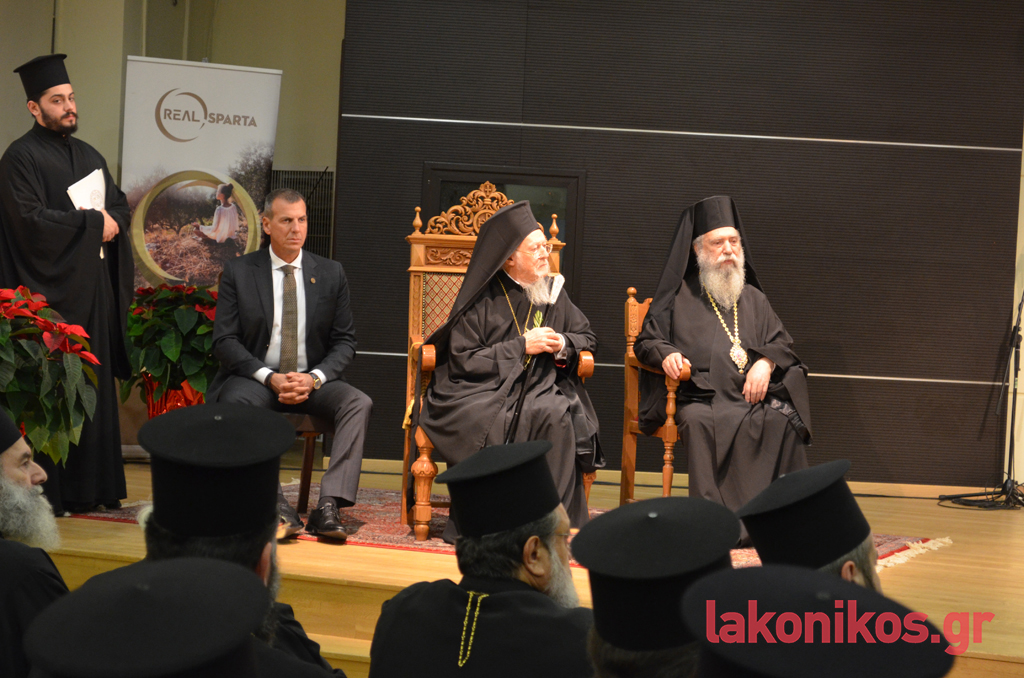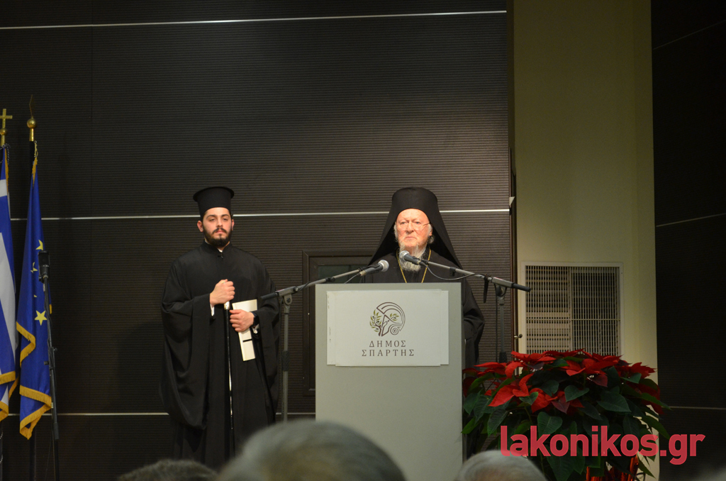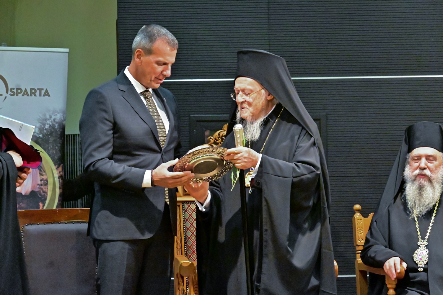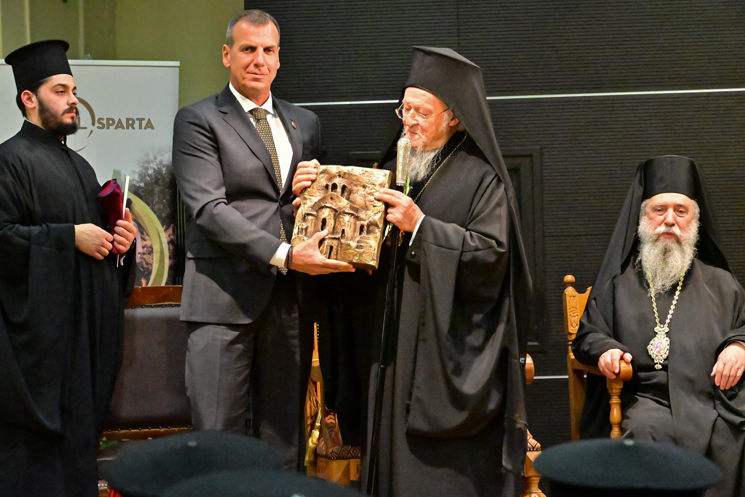 Τον χαιρετισμό ακολούθησε η εκφώνηση του επαίνου τού τιμωμένου, από τον πρόεδρο του Δημοτικού Συμβουλίου (ΔΣ) Σπάρτης, Στέφανο Βρεττάκο, ενώ στη συνέχεια προβλήθηκε βίντεο για την ευλογημένη δραστηριότητα του Οικουμενικού Πατριάρχη.