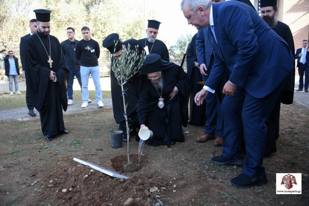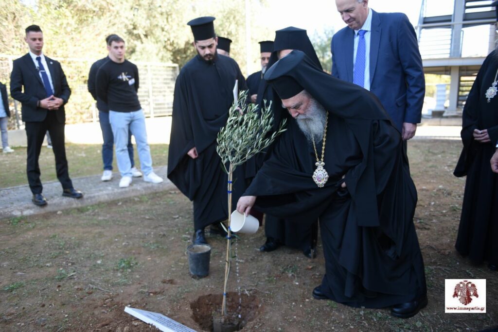 Μόλις ο Παναγιώτατος αφίχθη στις εγκαταστάσεις τού Πανεπιστημίου, οδηγήθηκε στον προαύλιο χώρο, όπου προέβη σε συμβολική φύτευση δενδρυλλίου ελαίας μαζί με τον σεβασμιώτατο Μητροπολίτη κ. Ευστάθιο.