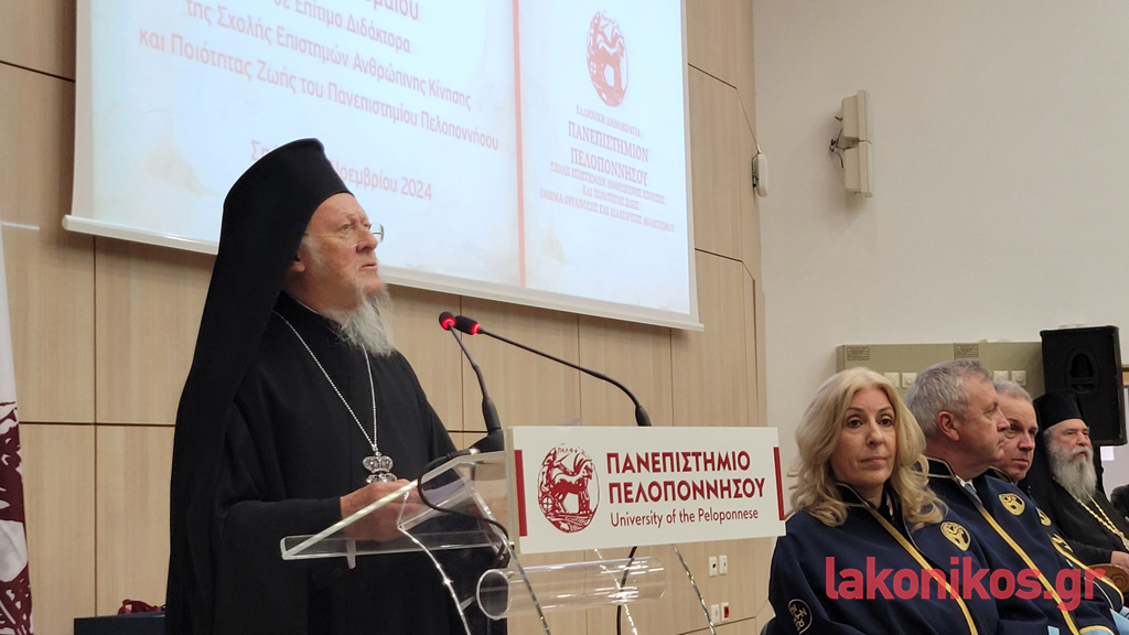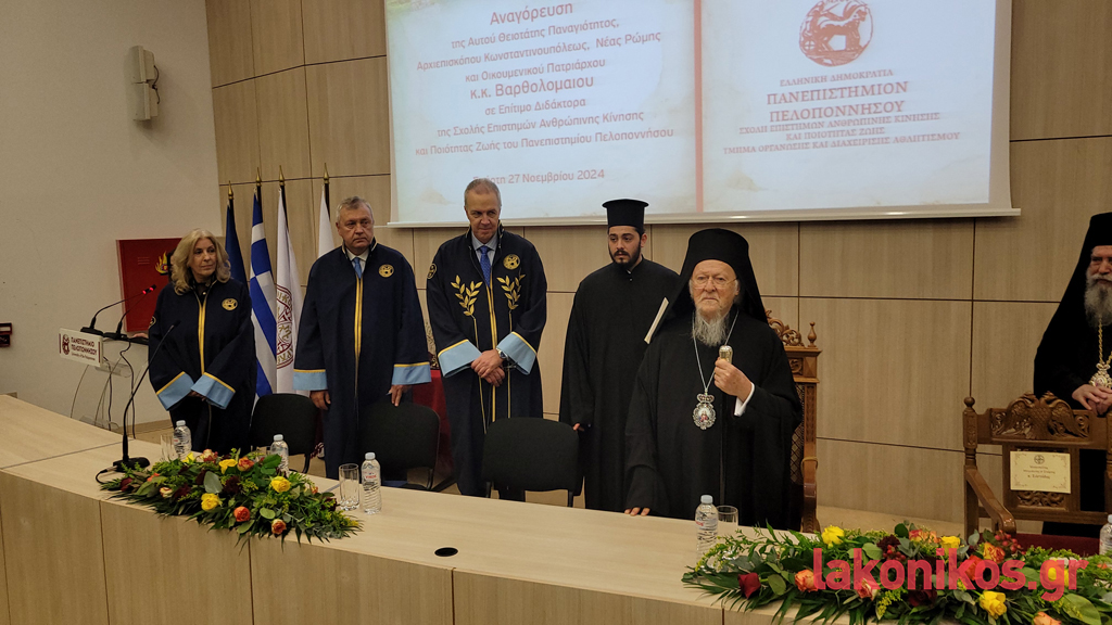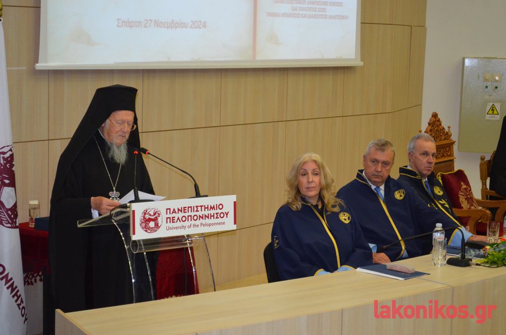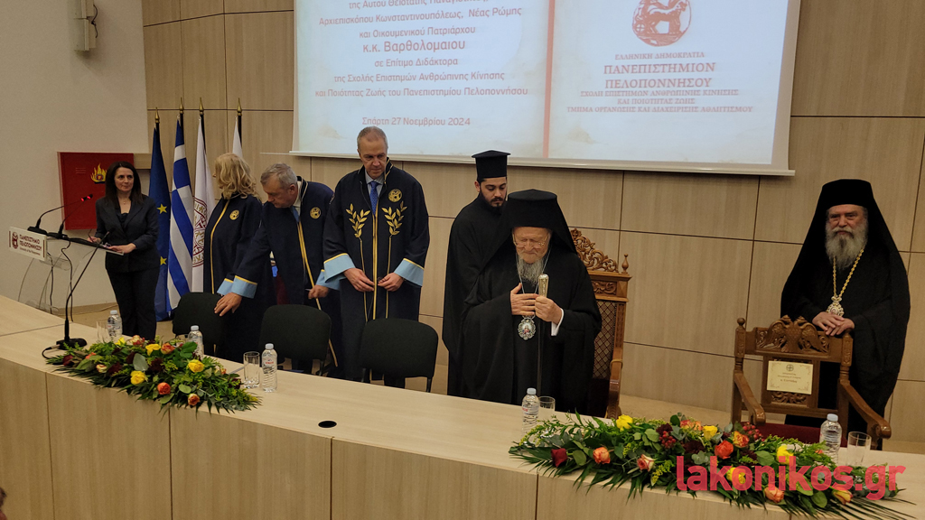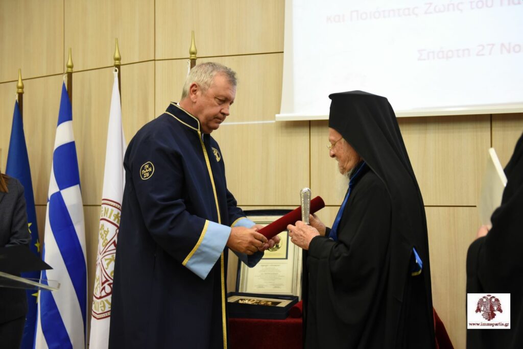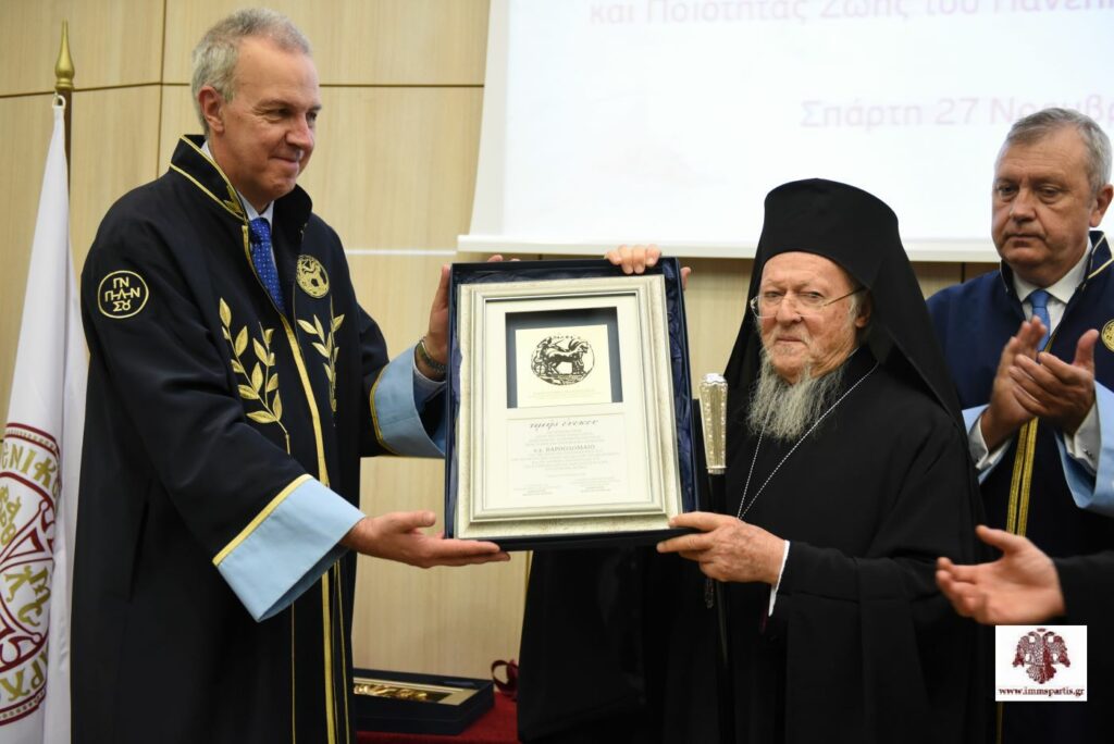 Την επόμενη ημέρα, το πρωί της Τετάρτης 27 Νοεμβρίου, στο αμφιθέατρο του Πανεπιστημίου Πελοποννήσου στη Σπάρτη, έλαβε χώρα η τελετή αναγόρευσης του Οικουμενικού Πατριάρχη σε Επίτιμο Διδάκτορα του Τμήματος Οργάνωσης και Διαχείρισης Αθλητισμού (ΤΟΔΑ) της Μονοτμηματικής Σχολής Επιστημών Ανθρώπινης Κίνησης και Ποιότητας Ζωής.