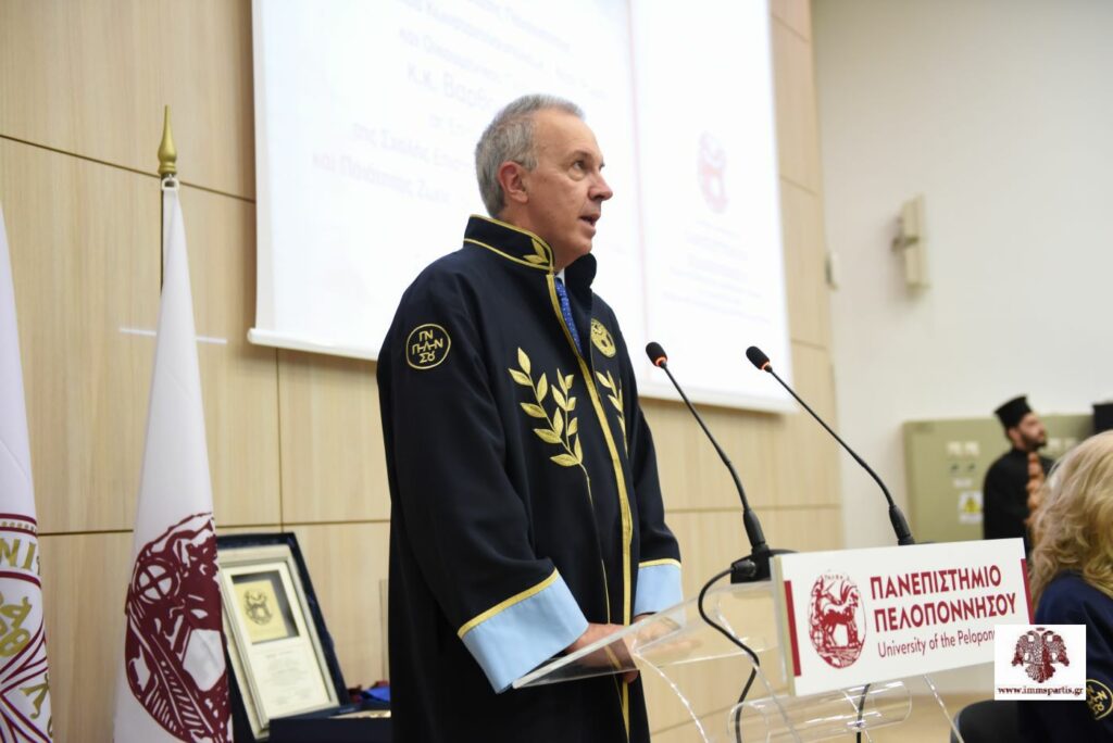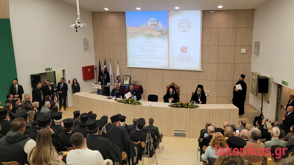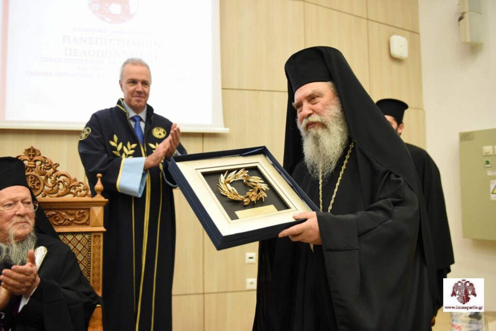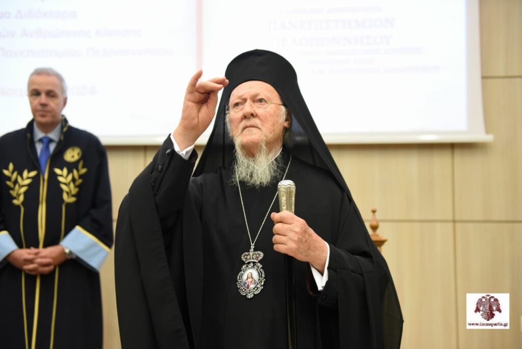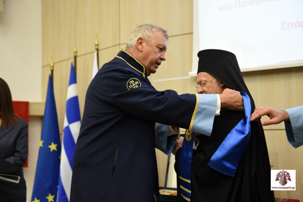 Την επόμενη ημέρα, το πρωί της Τετάρτης 27 Νοεμβρίου, στο αμφιθέατρο του Πανεπιστημίου Πελοποννήσου στη Σπάρτη, έλαβε χώρα η τελετή αναγόρευσης του Οικουμενικού Πατριάρχη σε Επίτιμο Διδάκτορα του Τμήματος Οργάνωσης και Διαχείρισης Αθλητισμού (ΤΟΔΑ) της Μονοτμηματικής Σχολής Επιστημών Ανθρώπινης Κίνησης και Ποιότητας Ζωής.