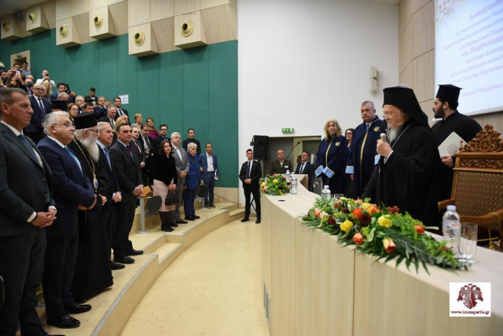 Αμέσως μετά, εγέρθηκαν προκειμένου ο Κοσμήτορας Γ. Κυπραίος να αναγνώσει το ψήφισμα και τον τίτλο επιτιμοποίησης του τιμωμένου και στη συνέχεια να προβεί στην αναγόρευση του κκ Βαρθολομαίου. Ακολούθησαν η επίδοση στον Οικουμενικό Πατριάρχη, των μεμβρανών και η τοποθέτηση του διασήμου από τον Κοσμήτορα, ενώ ο Πρύτανης επέδωσε στον Παναγιώτατο την τιμητική πλακέτα.