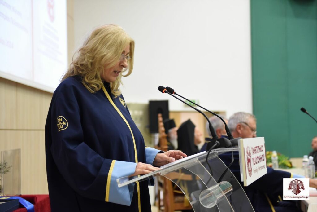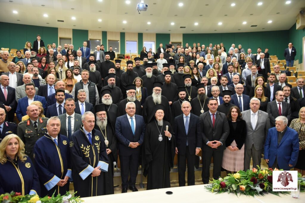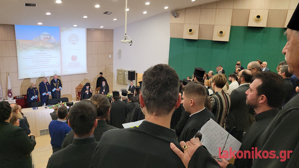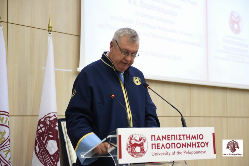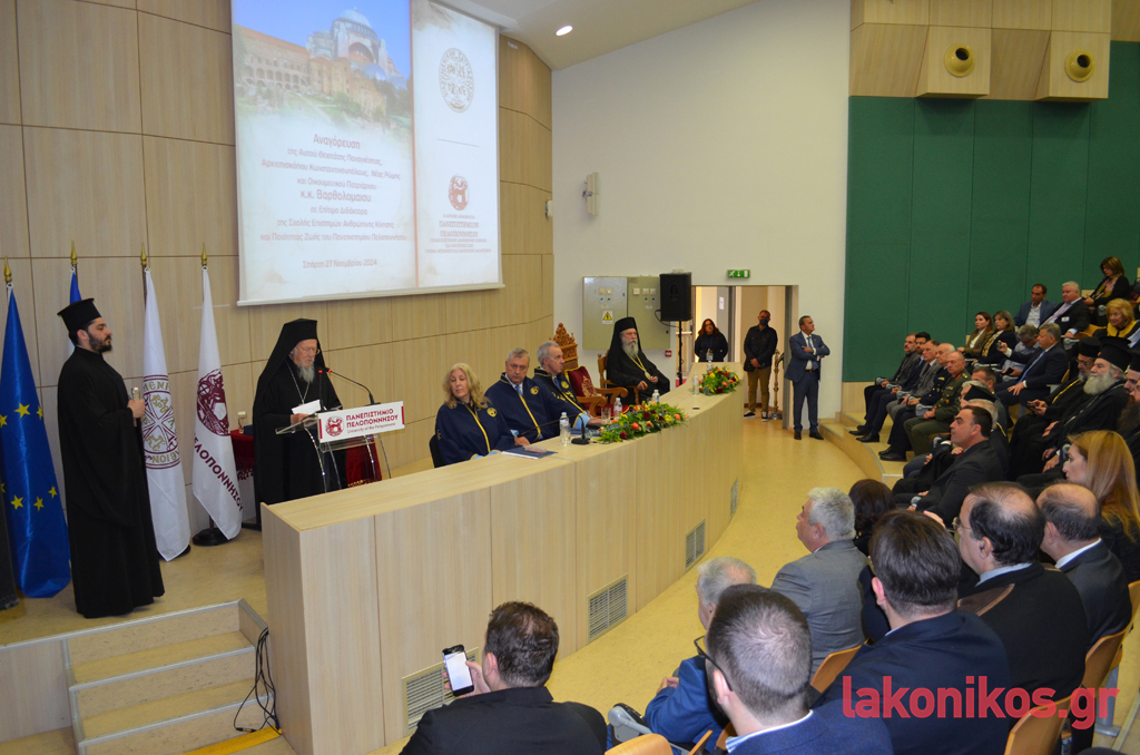 Μετά την είσοδο του κκ Βαρθολομαίου στον χώρο τού αμφιθεάτρου, ο Πρύτανης του Πανεπιστημίου Πελοποννήσου, Καθηγητής κ. Αθανάσιος Κατσής, απηύθυνε τον προσήκοντα χαιρετισμό. Ακολούθησε ο χαιρετισμός τού Κοσμήτορα της Σχολής Επιστημών Ανθρώπινης Κίνησης και Ποιότητας Ζωής, Καθηγητή κ. Γεωργίου Κυπραίου. Η τελετή συνεχίστηκε με την Καθηγήτρια του Τμήματος Οργάνωσης και Διαχείρισης Αθλητισμού, κ. Παναγιώτα Αντωνοπούλου, να εκφωνεί τον έπαινο του τιμωμένου, με λόγια που συγκίνησαν βαθιά όλους τους παρευρισκόμενους.