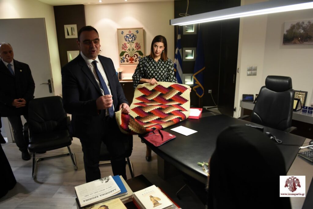 Συγκεκριμένα, το απόγευμα της Τρίτης 26 Νοεμβρίου, αμέσως μετά την τελετή αφής τής ιερής κανδήλας στον νεόδμητο ΙΝ Αγίου Ανανία, ο Προκαθήμενος της Ορθοδοξίας μετέβη στο παρακείμενο Διοικητήριο Λακωνίας. Εκεί, τον υποδέχτηκε σε ένθερμο κλίμα ο αντιπεριφερειάρχης Λακωνίας, Θ. Βερούτης, σε μια εθιμοτυπική συνάντηση στο γραφείο του, κατά τη διάρκεια της οποίας αντηλλάγησαν δώρα υψηλού συμβολισμού. Μεταξύ αυτών και ένα γερακίτικο παραδοσιακό υφαντό.