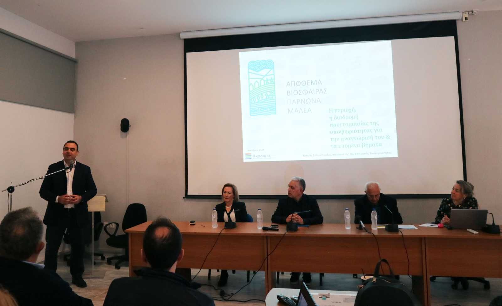 Εισηγήσεις παρουσιάστηκαν από την εκπαιδευτικό Μαρία Μυλωνά, η οποία μίλησε για τη «Συμβολή της περιβαλλοντικής εκπαίδευσης στη διατήρηση του Αποθέματος Βιόσφαιρας», τον Κοσμά Σιδηρόπουλο, συντονιστή της Επιτροπής Υποστήριξης της Υποψηφιότητας, που έκανε εισήγηση με θέμα «Ο πολιτισμός στην περιοχή του Πάρνωνα-Μαλέα» και την Ευαγγελία Μπάρλα, μηχανικό περιβάλλοντος, που αναφέρθηκε στο «Φυσικό περιβάλλον στην περιοχή αναφοράς».