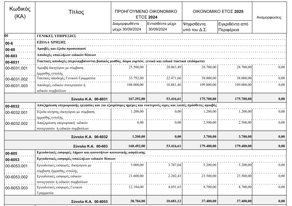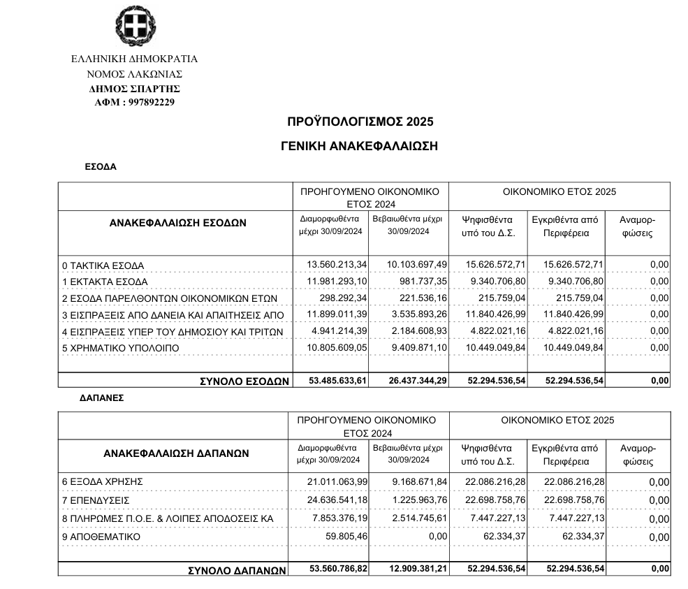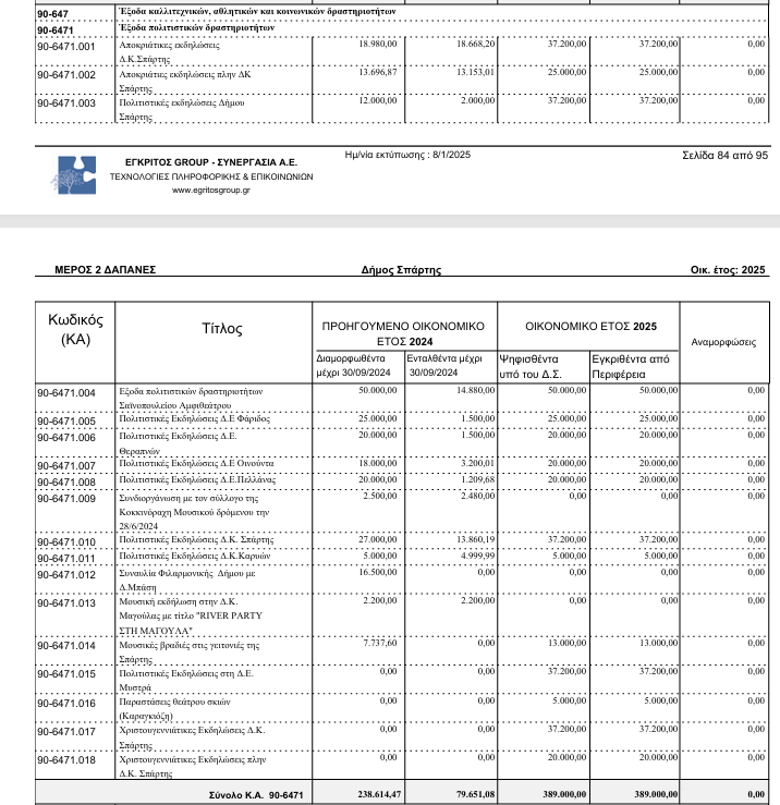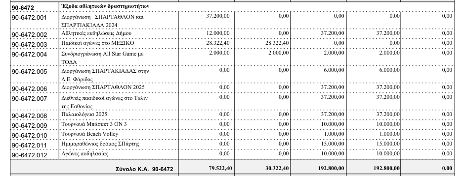 Από μία πρόχειρη επισκόπηση του μακροσκελούς προϋπολογισμού δαπανών του Δήμου Σπάρτης για το 2025, που περιήλθε σε γνώση του «Λακωνικού Τύπου», εντοπίζονται ορισμένα από τα έξοδα που συζητήθηκαν στο Δημοτικό Συμβούλιο. Ενδεικτικά: