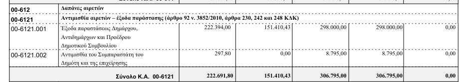 Σχετικά με τις αμοιβές υπαλλήλων ειδικών θέσεων (Γενικού Γραμματέα, ειδικών συνεργατών και συμβούλων, δικηγόρου με σύμβαση έμμισθης εντολής), το συνολικό ποσό ανέρχεται σε 179.400,00 ευρώ, ενώ τα έξοδα παραστάσεως Δημάρχου, Αντιδημάρχων και Προέδρου Δημοτικού Συμβουλίου σε 298.000,00 ευρώ.