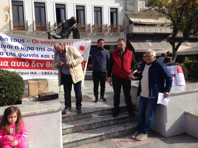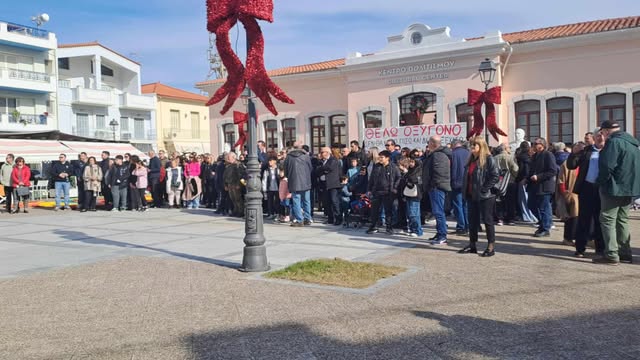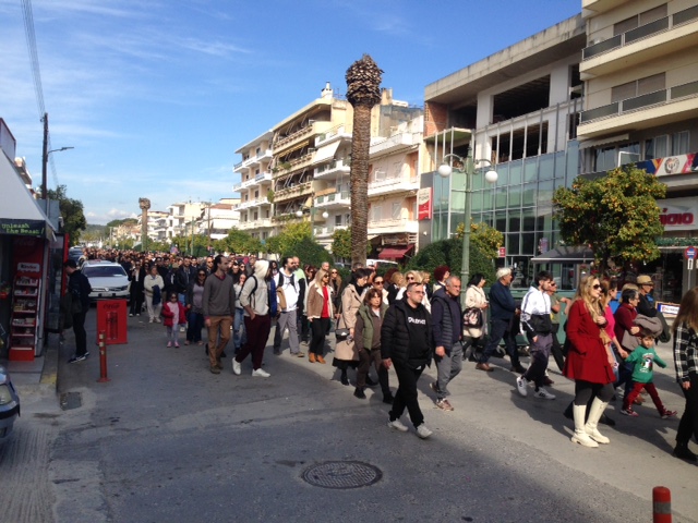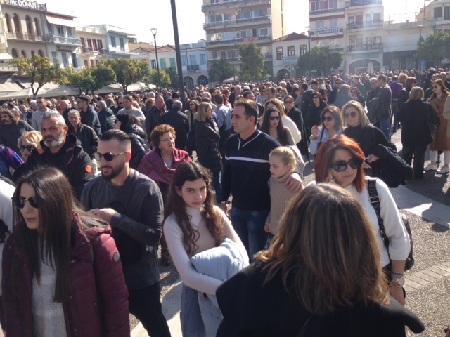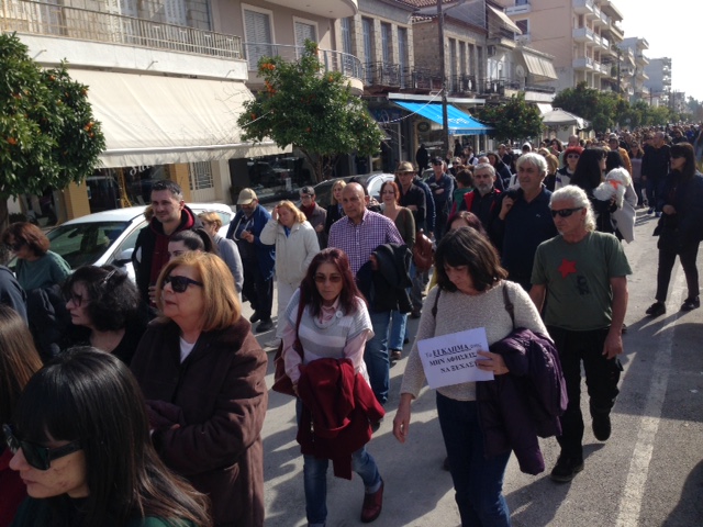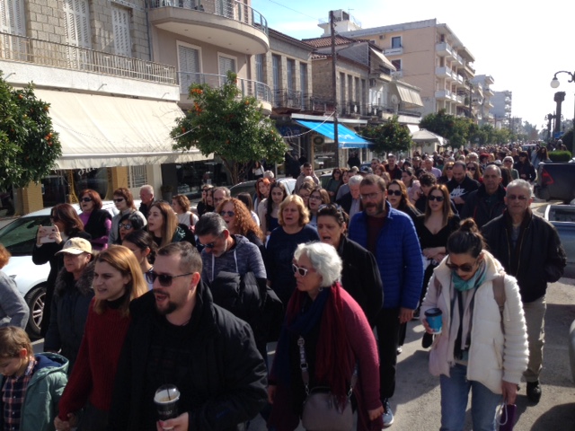 Αυθόρμητα αποφασίστηκε η συγκέντρωση να προχωρήσει σε πορεία. Το μεγάλο πλήθος διέσχισε την λεωφόρο Κων/νου Παλαιολόγου, έφτασε στην Πινακοθήκη και επέστρεψε στην κεντρική πλατεία. Σφιγμένα πρόσωπα και συγκίνηση. Εντοπίσαμε δακρυσμένους πολίτες, ακόμα και αν δεν συμμετείχαν στην πορεία. Λίγα συνθήματα ακούστηκαν, σποραδικά. Μα ένα στρίγγλιζε στα αυτιά, «Δεν έχω οξυγόνο, δεν έχω οξυγόνο».