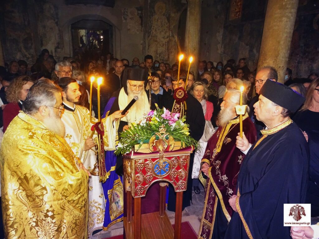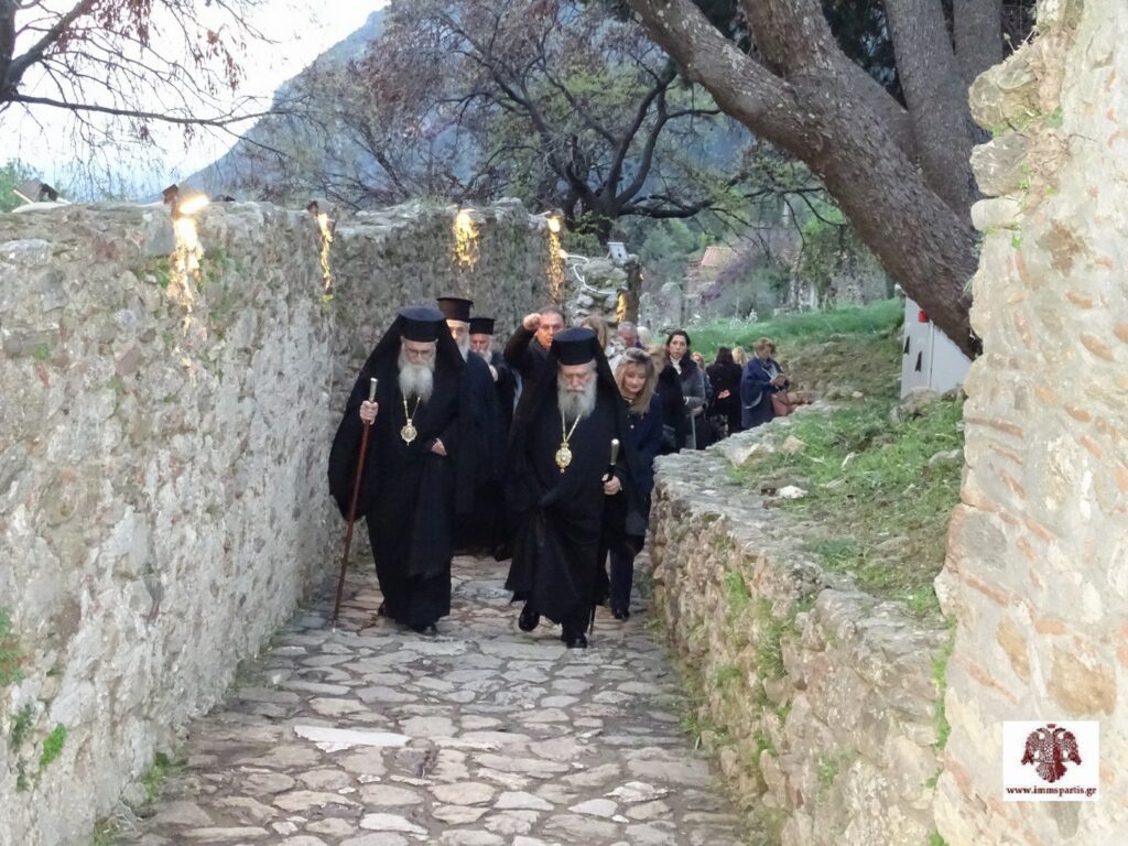Κατά τη διάρκεια της εσπερινής λατρευτικής σύναξης, ο σεβασμιώτατος κ. Ευστάθιος καλωσόρισε τους πολυάριθμους ευλαβείς προσκυνητές στον ιστορικό Μυστρά, που «είναι αγιασμένος με τα αίματα των μαρτύρων της Πίστεως και της Πατρίδας μας και είναι ποτισμένος με τα δάκρυα ή της μετανοίας ή της αγωνίας πατέρων και αδελφών μας που έζησαν εκεί».