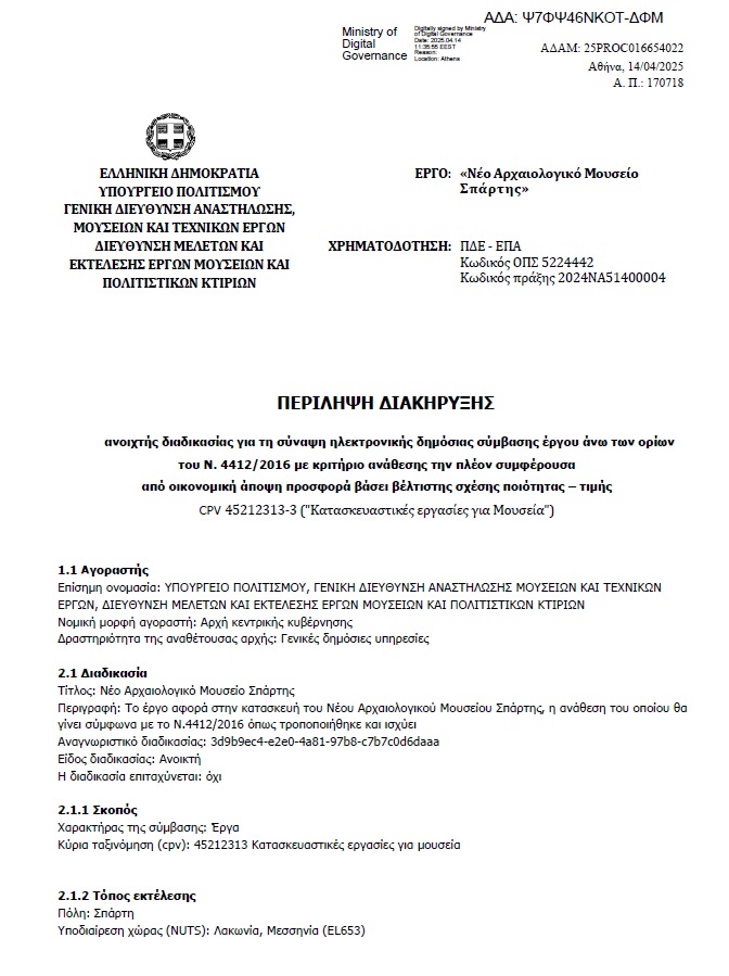 Αρχές της Μεγάλης Εβδομάδας έλαβε τέλος η προσμονή για το επόμενο βήμα προς την υλοποίηση του νέου Αρχαιολογικού Μουσείου Σπάρτης, που ήταν η διακήρυξη του διαγωνισμού, επαληθεύοντας τις εκτιμήσεις, όπως σας είχε ενημερώσει προ μηνός περίπου και ο «ΛΤ». Το πρωί της Μ. Δευτέρας (14/4) αναρτήθηκε από το Υπουργείο Πολιτισμού/Γενική Διεύθυνση Αναστήλωσης Μουσείων και Τεχνικών Έργων/Διεύθυνση Μελετών και Εκτέλεσης Έργων Μουσείων και Πολιτιστικών Κτιρίων, η διακήρυξη της ανοικτής διαδικασίας για τη σύναψη ηλεκτρονικής δημόσιας σύμβασης για το έργο κατασκευής της πολιτισμικής μονάδας. Το έγγραφο για το επόμενο στάδιο του έργου δημοσιοποιήθηκε στη Διαδικτυακή Πύλη Ηλεκτρονικών Δημοσίων Συμβάσεων και καταχωρήθηκε στην Ενιαία Αρχή Δημοσίων Συμβάσεων (ΕΑΔΥΣΥ).