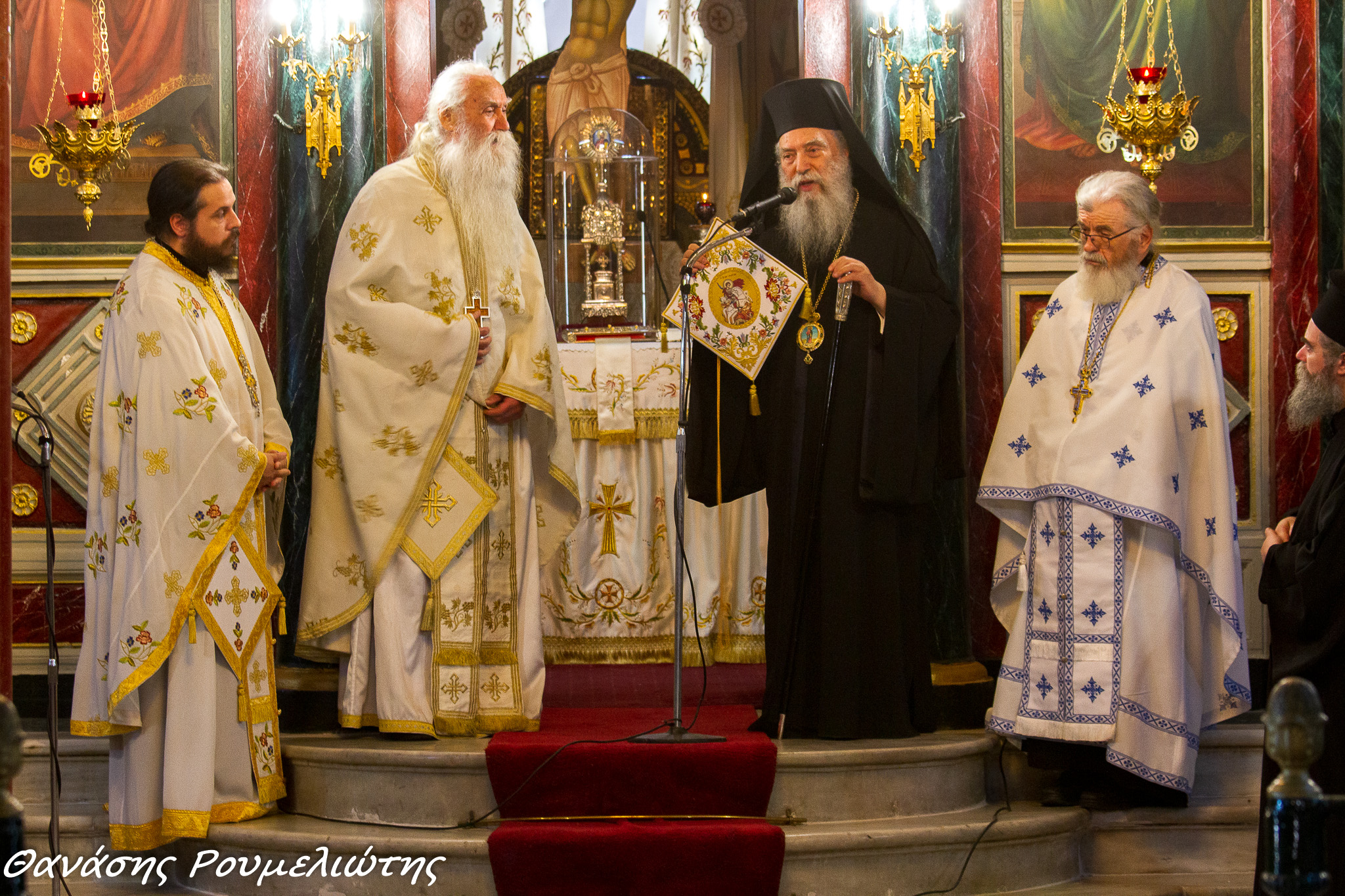 Από την πλευρά του, ο σεβασμιώτατος κ. Ευστάθιος μίλησε με θερμά λόγια «για τη βαθιά πίστη» τού πατρός Γεωργίου, «την πολύτιμη προσφορά του στον Μητροπολιτικό Ναό και στην Ιερά Μητρόπολή μας γενικότερα», αλλά και «τις αστείρευτες γνώσεις του για την τοπική ιστορία, που αποτελούν παρακαταθήκη για τις επόμενες γενιές». Ολοκληρώνοντας, τού πρόσφερε συμβολικά, ένα επιγονάτιο, το οποίο φέρει την μορφή του Αγίου Γεωργίου.