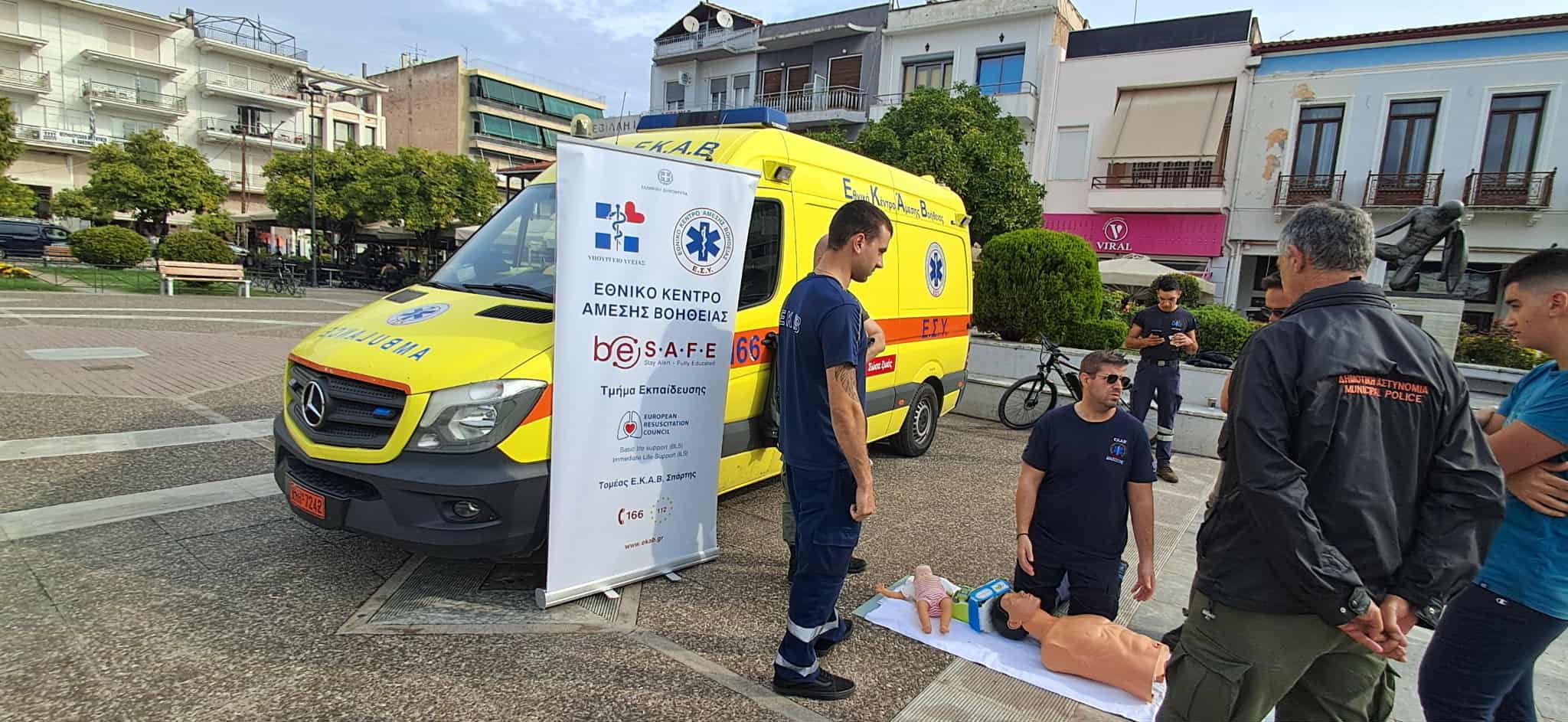Οι διασώστες, νοσηλευτές και ιατροί του ΕΚΑΒ πραγματοποίησαν επιδείξεις με προπλάσματα και εκπαιδευτικούς απινιδωτές, δείχνοντας βήμα-βήμα πώς μπορεί κάποιος πολίτης να προσφέρει άμεση και κρίσιμη βοήθεια μέχρι να φτάσει το ασθενοφόρο.
