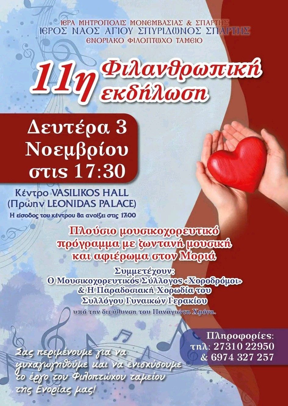 Η εκδήλωση που αποτελεί πλέον θεσμό για την Ενορία Αγίου Σπυρίδωνος και τελεί υπό την ευλογία του σεβασμιώτατου Μητροπολίτη Μονεμβασίας και Σπάρτης κ. Ευσταθίου, συνδυάζει τη διασκέδαση με την προσφορά, με στόχο την ενίσχυση του έργου του ενοριακού φιλόπτωχου ταμείου του ναού. Το πρόγραμμα περιλαμβάνει πλούσιο μουσικοχορευτικό θέαμα με ζωντανή μουσική και ένα ιδιαίτερο αφιέρωμα στον Μοριά, αναδεικνύοντας την παράδοση και τη μουσική μας κληρονομιά.