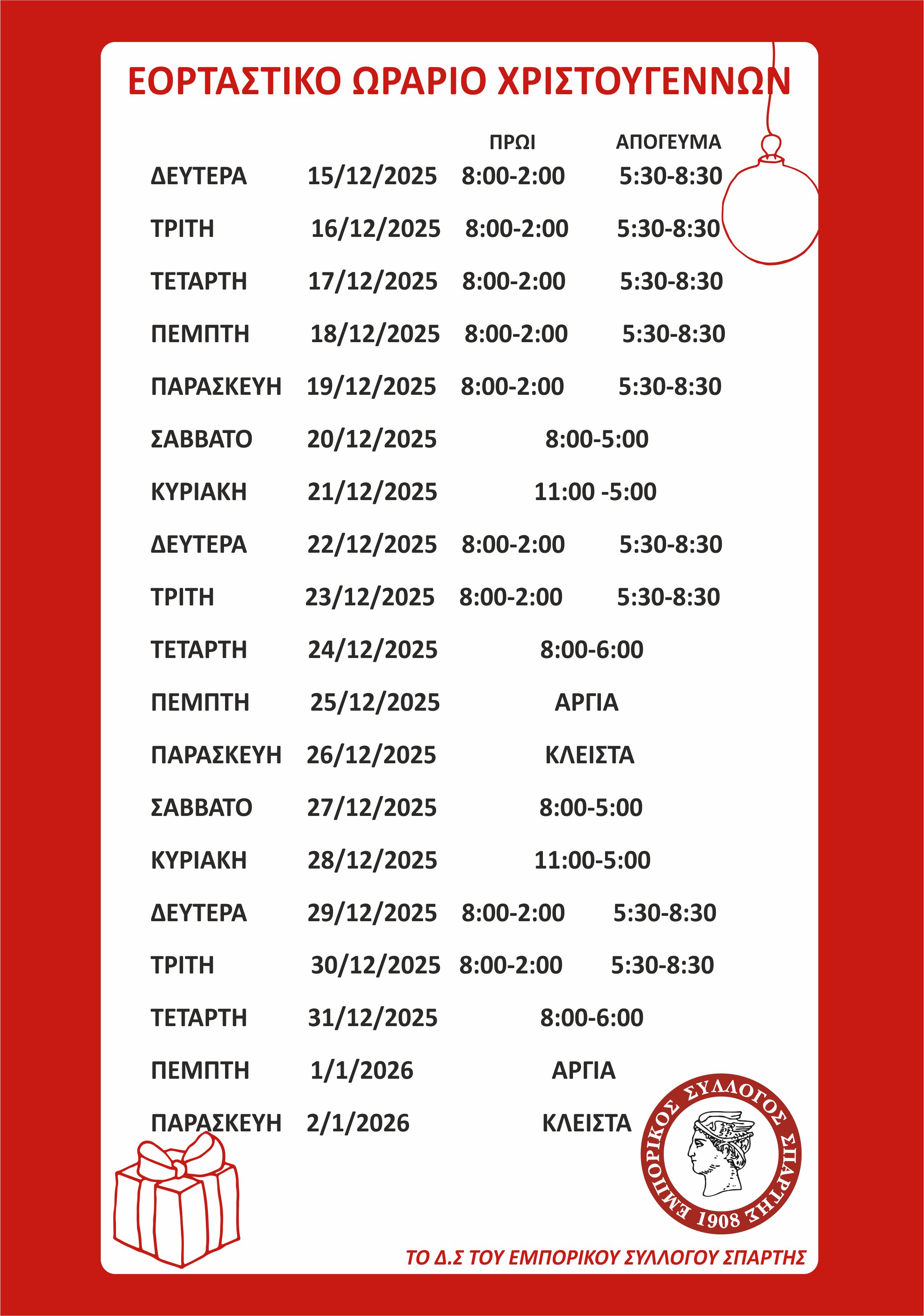 Ο Εμπορικός Σύλλογος Σπάρτης ανακοίνωσε το εορταστικό ωράριο λειτουργίας των καταστημάτων για την περίοδο των Χριστουγέννων και της Πρωτοχρονιάς, με στόχο τη διευκόλυνση των πολιτών κατά την αυξημένη εμπορική κίνηση των ημερών. Τα καταστήματα θα λειτουργούν με διευρυμένο ωράριο, επιτρέποντας στο κοινό να πραγματοποιήσει τις εορταστικές του αγορές σε πιο ευέλικτο πλαίσιο.