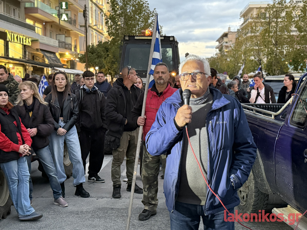 Το μικρόφωνο πήρε και αγροτοκτηνοτρόφος από τη Φάριδα, Παναγιώτης Παυλούνης, επίσης μέλος του Συντονιστικού Μπλόκου Λακωνίας, που είπε ότι «εδώ δεν χωρούν κόμματα και χρώματα», ενώ μίλησε για τη μαζική θανάτωση ζώων λόγω Ευλογιάς κι έθιξε το αίτημα για χορήγηση εμβολίου, καθώς «θα καταστραφούμε». Απαίτησε ακόμα να «λυθεί το θέμα του ΟΠΕΚΕΠΕ, γιατί δεν γίνεται να πληρώσουμε εμείς -από δικές μας επιδοτήσεις- τα λεφτά που έφαγαν όλοι». Έθεσε ακόμα άλλα ζητήματα που αντιμετωπίζουν οι παραγωγοί. Και κατέληξε με νόημα: «Δίνουμε το αρνί για 8,5€/κιλό στον χασάπη και το λάδι στα 5€ και τα αγοράζουν οι καταναλωτές αμφότερα στα 15 ευρώ. Το μέλι νοθευμένο, το ίδιο και το γάλα».