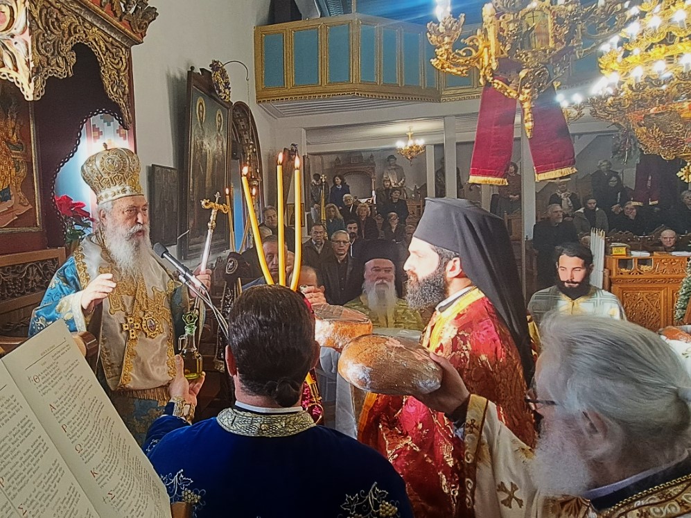 Από την πλευρά του, ο σεπτός Ποιμενάρχης κ. Ευστάθιος επαίνεσε τον π. Λάζαρο και τον κ. Δαβάκη για τις πρωτοβουλίες που ανέλαβαν, καθώς και όλους όσοι βοήθησαν με οποιονδήποτε τρόπο στην αποκατάσταση του ναού. Μάλιστα, τόνισε ότι «τέτοιες δυσκολίες τις επιτρέπει πολλές φορές ο Θεός για να ενεργοποιηθούν αδρανείς δυνάμεις και να για να ενωθεί μία κοινωνία κάτω από ένα κοινό σκοπό». Ιδιαίτερες ευχαριστίες εξέφρασε ο Ιεράρχης προς τον κ. Αθανάσιο Μαρτίνο, «που αποτελεί πολύτιμο στήριγμα, με το πολυποίκιλο φιλανθρωπικό έργο του», για το Οικουμενικό Πατριαρχείο, για άλλα Πατριαρχεία, την Εκκλησία της Ελλάδος, το Άγιο Όρος και άλλους φορείς. Μάλιστα, η τοπική Εκκλησία θα τιμήσει καταλλήλως τον κ. Μαρτίνο όταν ολοκληρωθεί και το μεγάλο έργο που έχει αναλάβει με αποκλειστική χορηγία του, αυτό της ανακαίνισης εσωτερικά και εξωτερικά του Μητροπολιτικού Ναού Ευαγγελιστρίας και της ανακαίνισης της Στέγης Νεότητας της ΙΜΜΣ.