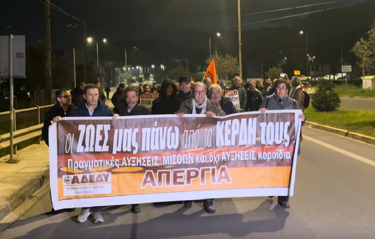 Οι συγκεντρωθέντες ξεκίνησαν από το «ΦΙΞ» και πραγματοποίησαν πορεία μέσω της παλαιάς γέφυρας του Ευρώτα, καταλήγοντας στο μπλόκο κάτω από τη γέφυρα του «Μορέα», όπου ενώθηκαν με τους αγροτοκτηνοτρόφους. Παρόντες ήταν εκπρόσωποι της ΑΔΕΔΥ Λακωνίας, του Εργατικού Κέντρου, εργαζόμενοι στην Περιφερειακή Ενότητα Λακωνίας και στο Νοσοκομείο Μολάων, εκπαιδευτικοί της Πρωτοβάθμιας Εκπαίδευσης από όλο τον νομό, συνταξιούχοι του Σωματείου ΙΚΑ–ΕΦΚΑ, του Ιατρικού Συλλόγου Λακωνίας κ.α..