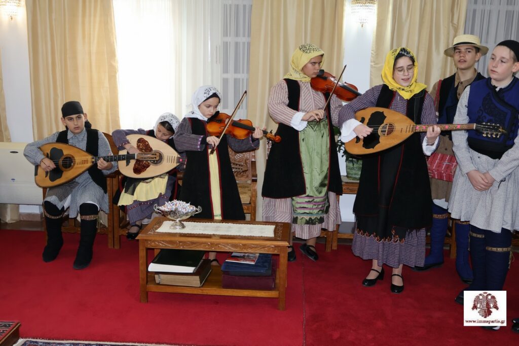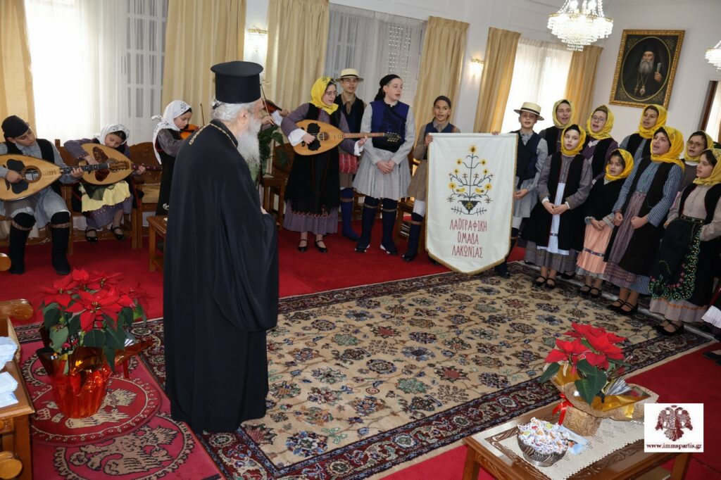 Την προηγούμενη ημέρα, τα κάλαντα έψαλαν παιδιά του Λαογραφικού Ομίλου Λακωνίας, που είναι ένας Πολιτιστικός Σύλλογος παραδοσιακών χορών που δραστηριοποιείται στη Σπάρτη. Τα παιδιά, ενδεδυμένα με παραδοσιακές φορεσιές και συνοδευόμενα από τον υπεύθυνο, κ. Νίκο Μπαριάμη, παρουσίασαν με εξαιρετικό τρόπο -και συνοδεία παραδοσιακών οργάνων- κάλαντα από την Ρειχιά και τα Πιστάματα Ζάρακος, καθώς και από τις Καρυές του Πάρνωνα. Ο σεβασμιώτατος συνεχάρη τα παιδιά και τον Ν. Μπαριάμη για την αξιέπαινη παρουσία τους, υπογράμμισε «την αξία της διατήρησης των εθίμων και της παράδοσης του τόπου μας», ενώ τους ευχήθηκε «να πορεύονται πάντα στον δρόμο της αρετής και της μάθησης».