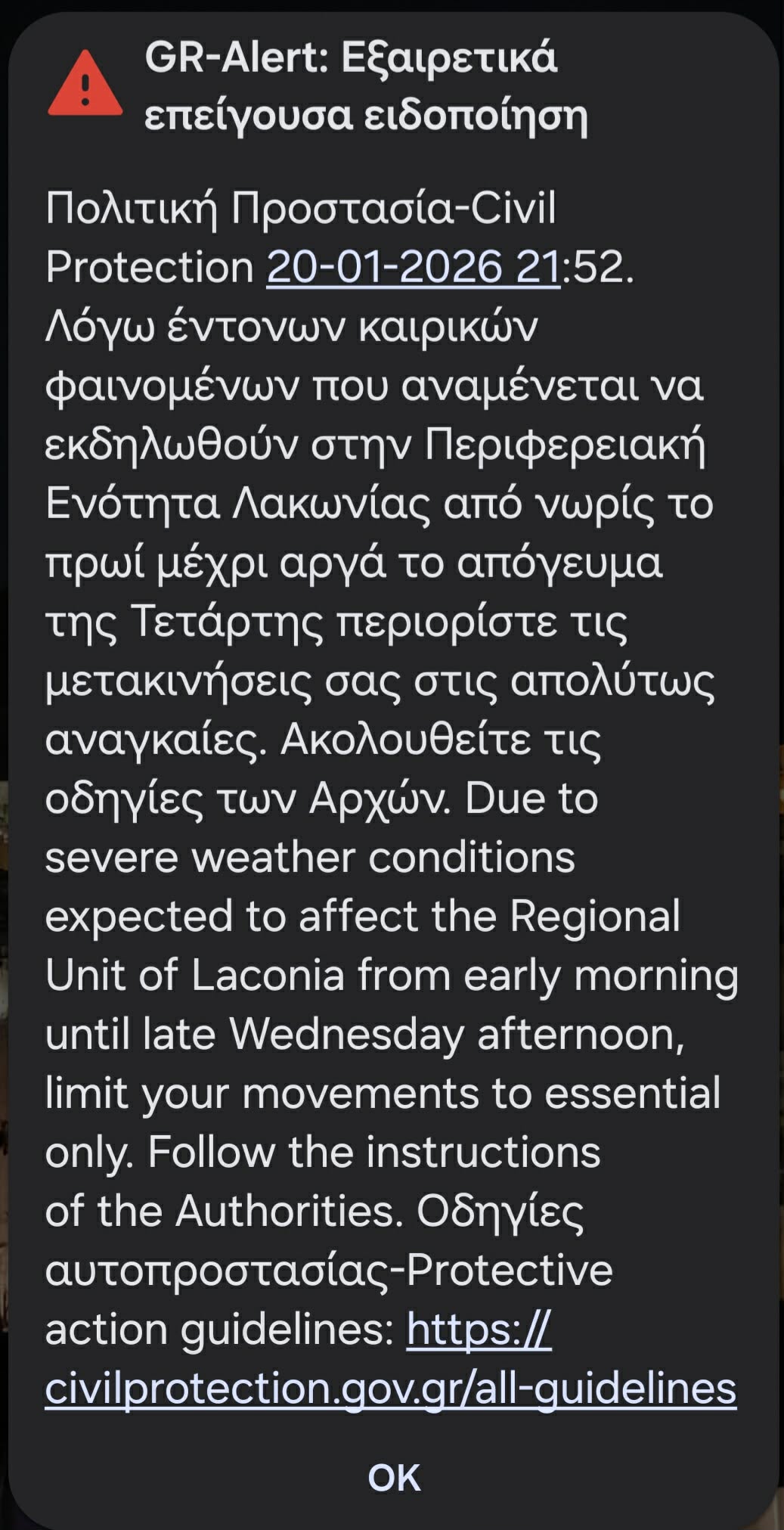 Η Λακωνία τέθηκε σε καθεστώς αυξημένου συναγερμού «Red Code», χθες Τετάρτη (21/1), λόγω της πρόγνωσης για έντονα καιρικά φαινόμενα, υπό τα χαρακτηριστικά κυρίως ισχυρών βροχοπτώσεων, αλλά και δυνατού αέρα. Οι Αρχές, από την ΠΕ Λακωνίας, μέχρι τους δήμους, τα Σώματα Ασφαλείας, τους εθελοντές κλπ, βρίσκονταν σε πλήρη επιφυλακή και συντονισμό, καθ’ όλη τη διάρκεια της ημέρας. Το βράδυ της Τρίτης, πολίτες σε Σπάρτη και άλλες περιοχές της Λακωνίας, έλαβαν ειδοποίηση στα κινητά τους τηλέφωνα μέσω του 112, για την επερχόμενη κακοκαιρία. Το μήνυμα προειδοποιούσε για έντονα καιρικά φαινόμενα, από νωρίς το πρωί μέχρι αργά το απόγευμα της Τετάρτης, σε όλο τον νομό, καλώντας τους πολίτες να περιορίσουν τις μετακινήσεις τους στις απολύτως απαραίτητες.