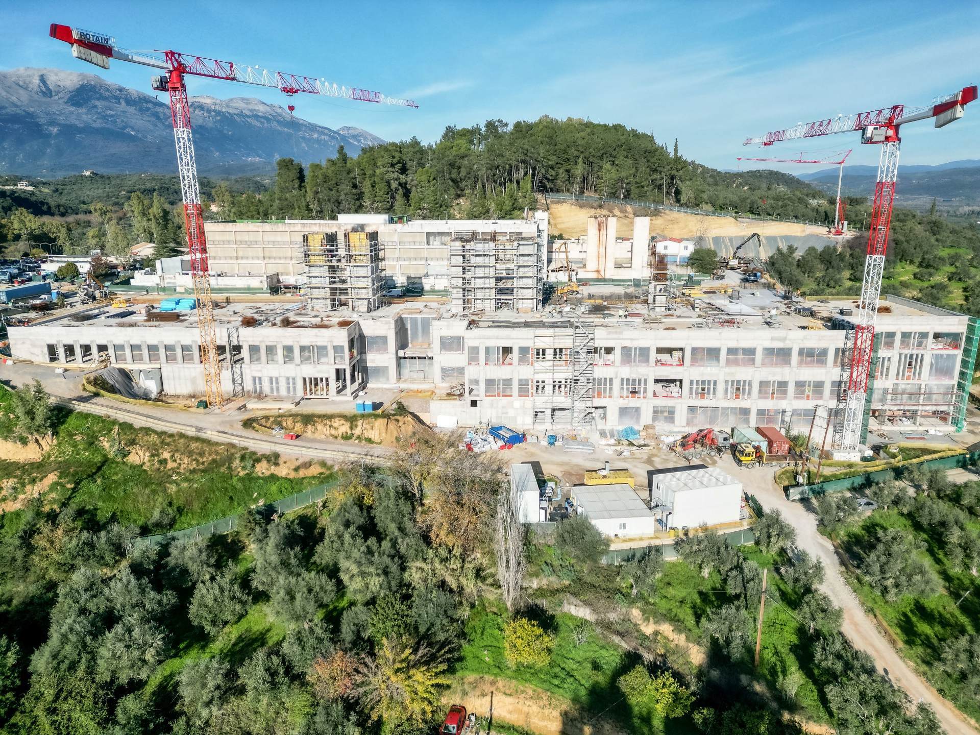 Όπως αναφέρθηκε στη συνάντηση, η κατασκευή των σκυροδεμάτων βρίσκεται περίπου στο 95%, ενώ επόμενος ορίζοντας είναι η ολοκλήρωση του κελύφους. Έχουν ολοκληρωθεί οι εκσκαφές του κεντρικού κτιρίου και του κέντρου ενέργειας, καθώς και η κατασκευή των σκυροδεμάτων στο νότιο τμήμα του κτιριακού συγκροτήματος. Σε εξέλιξη βρίσκονται οι αντίστοιχες εργασίες στο βόρειο τμήμα, στις απολήξεις των πυρήνων και στο κέντρο ενέργειας, όπως επίσης οι υγρομονώσεις, η κατασκευή του ξύλινου φέροντος οργανισμού και παρεμβάσεις στους εσωτερικούς χώρους που περιλαμβάνουν τοιχοποιίες, ξηρά δόμηση και ηλεκτρομηχανολογικές εγκαταστάσεις. Παράλληλα εκτελούνται εργασίες στα κατώτερα επίπεδα και στους εσωτερικούς χώρους, ενώ θα ακολουθήσουν εργασίες διαμόρφωσης του περιβάλλοντος χώρου (κήπος). Προχωρά επίσης η προμήθεια του ιατρικού εξοπλισμού και των υποδομών πληροφορικής, ενώ το νέο νοσοκομείο θα διεκδικήσει διάφορες πιστοποιήσεις. Το Δημόσιο έχει δεσμευτεί να υλοποιήσει ακόμα συνοδά έργα, όπως οδοποιία και γεώτρηση.