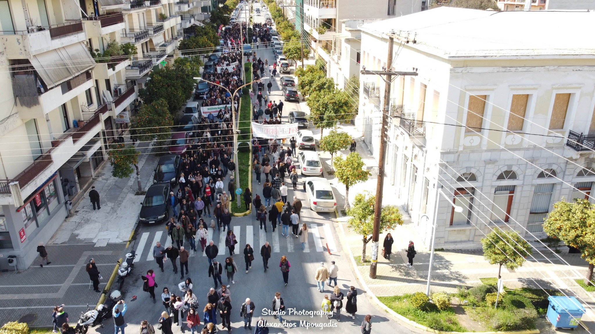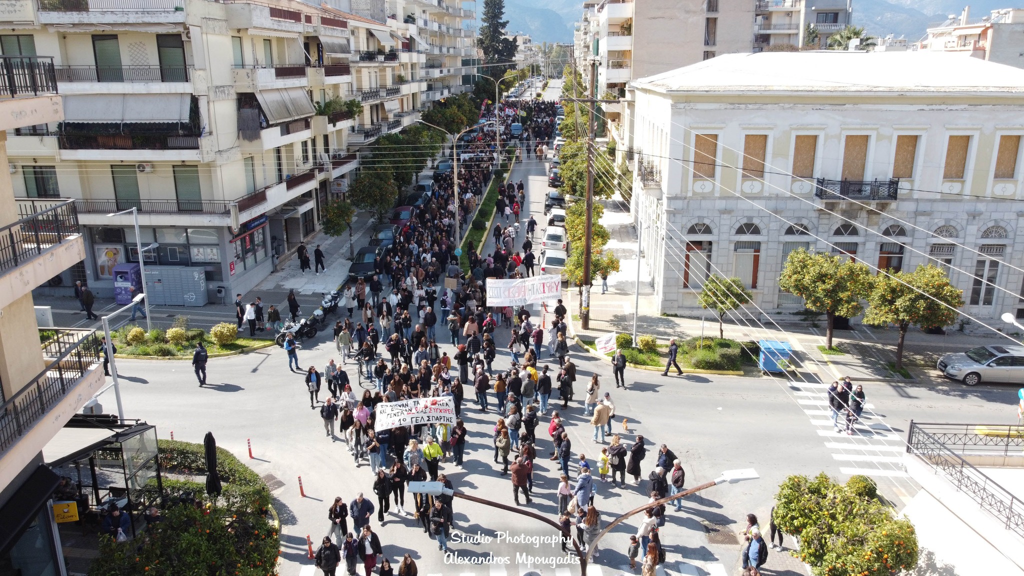 Μετά το πέρας των ομιλιών ακολούθησε πορεία στους κεντρικούς δρόμους της πόλης, με τη διαδρομή να περνά από τις Λεωφόρους Παλαιολόγου και Λυκούργου, και τους πολίτες να δημιουργούν μια μεγάλη ανθρώπινη αλυσίδα που εκτεινόταν σε μεγάλο μήκος. Οι εικόνες από ψηλά ανέδειξαν τον όγκο της συμμετοχής, με τους διαδηλωτές να κινούνται οργανωμένα και ειρηνικά.