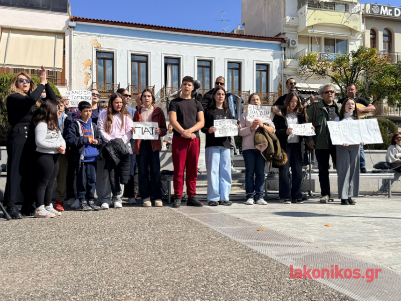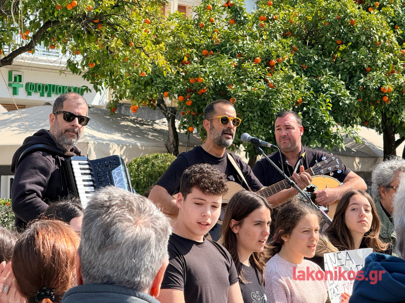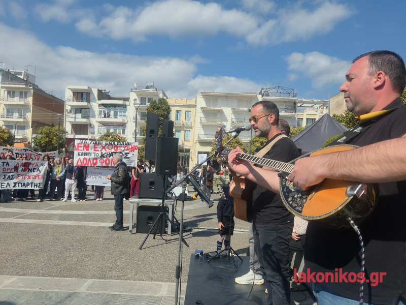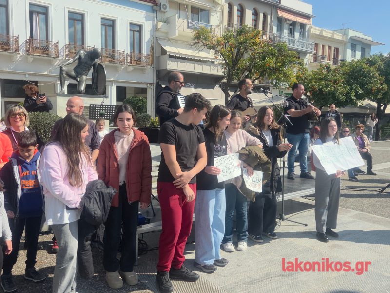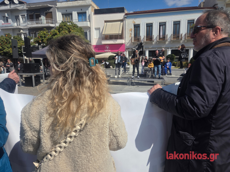 Εν συνεχεία η πομπή επέστρεψε στην κεντρική πλατεία. Η κινητοποίηση ολοκληρώθηκε με μουσική διαμαρτυρία και συναυλία του σχήματος «Γραμμές» σε συνεργασία με το Μουσικό Σχολείο Σπάρτης. Η πιο συγκινητική στιγμή της εκδήλωσης ήρθε στο κλείσιμο, όταν μαθητές του Μουσικού Σχολείου ένωσαν τις φωνές τους με τους μουσικούς και το συγκεντρωμένο πλήθος ερμηνεύοντας το «Της Δικαιοσύνης ήλιε νοητέ», σε μια συμβολική κορύφωση της ημέρας.