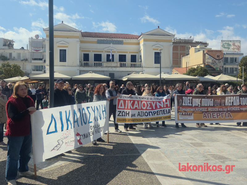 Στη συγκέντρωση στην κεντρική πλατεία συμμετείχαν, μεταξύ άλλων, το Νομαρχιακό Τμήμα Λακωνίας της ΑΔΕΔΥ, το Εργατοϋπαλληλικό Κέντρο Λακωνίας, η Ένωση Φοροτεχνικών Λογιστών Λακωνίας, η Ομοσπονδία Επαγγελματικών και Εμπορικών Σωματείων Λακωνίας και το Σωματείο Συνταξιούχων ΙΚΑ-ΕΦΚΑ Λακωνίας. Παρόντες ήταν ακόμη ο Σύλλογος Υπαλλήλων ΠΕ Λακωνίας, οι Σύλλογοι Εκπαιδευτικών Πρωτοβάθμιας Εκπαίδευσης, ο Φοιτητικός Σύλλογος Σπάρτης, η Ομάδα Γυναικών Καστορείου, η Ένωση Συλλόγων Γονέων Δήμου Σπάρτης, μαθητές από το Μουσικό Σχολείο και το 1ο Γενικό Λύκειο Σπάρτης κ.α..