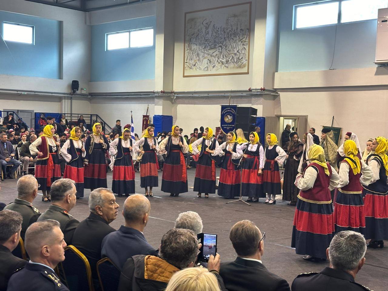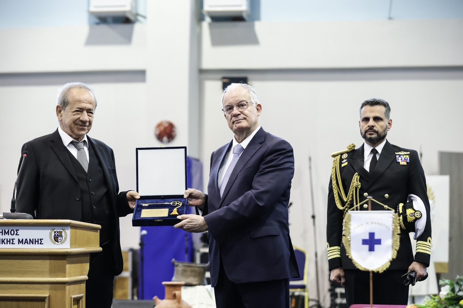 Λόγω των δυσμενών καιρικών συνθηκών, το μεγαλύτερο μέρος των εκδηλώσεων μεταφέρθηκε στο Κλειστό Γυμναστήριο Αρεόπολης. Εκεί, ο δήμαρχος Ανατολικής Μάνης Πέτρος Ανδρεάκος καλωσόρισε τον Πρόεδρο της Δημοκρατίας, ανακηρύσσοντας τον επίτιμο δημότη Ανατολικής Μάνης, με την απονομή του «χρυσού κλειδιού» του δήμου, κατόπιν ομόφωνης απόφασης του Δημοτικού Συμβουλίου.