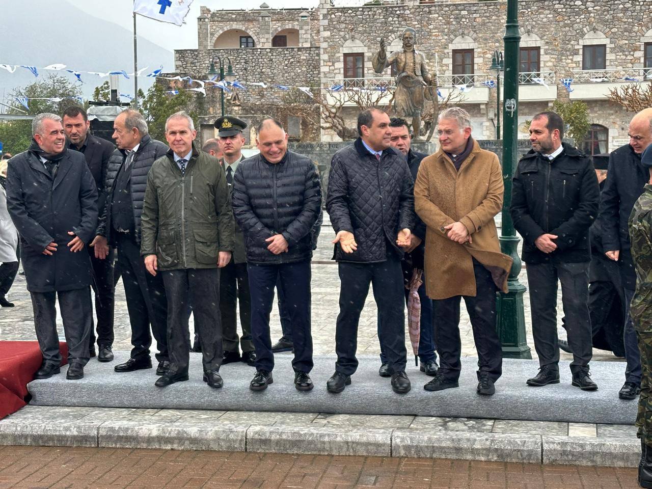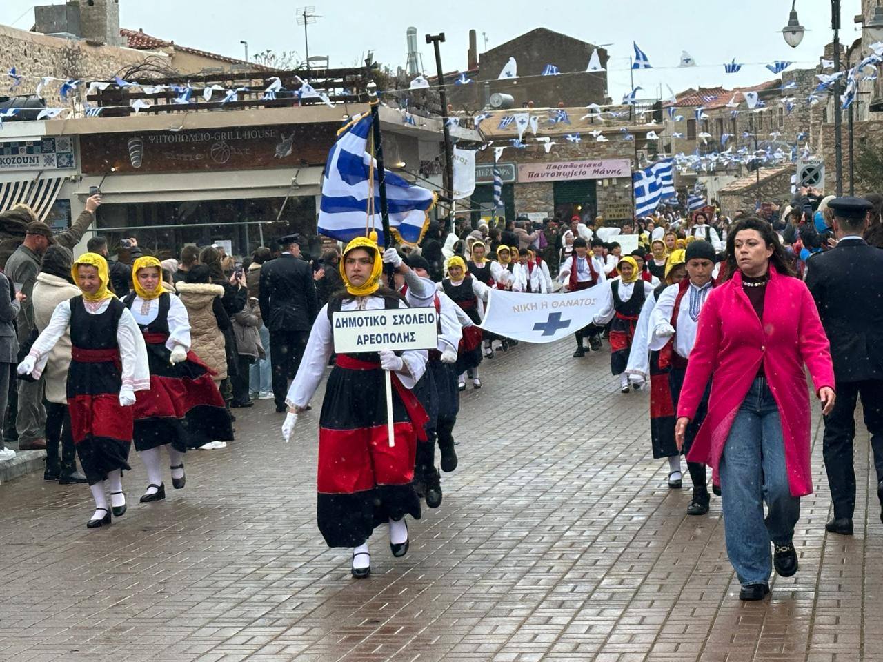 Η υπουργός Δ. Μιχαηλίδου, στον χαιρετισμό της τόνισε ότι στην Αρεόπολη δεν τιμάται απλώς μια ιστορική ημερομηνία, αλλά μια απόφαση ευθύνης και ελευθερίας. Όπως υπογράμμισε, το 1821 άνθρωποι «λίγοι σε αριθμό αλλά ακέραιοι σε βούληση» πήραν μια απόφαση χωρίς επιστροφή, γνωρίζοντας όχι αν θα νικήσουν, αλλά ότι δεν μπορούσαν να συνεχίσουν αλλιώς. Επεσήμανε ότι η Ελληνική Επανάσταση δεν ξεκίνησε από βεβαιότητες, αλλά από επίγνωση και βαθιά συνείδηση της ανάγκης για ελευθερία, τονίζοντας ότι «η ελευθερία δεν είναι αποτέλεσμα ευνοϊκών συνθηκών, αλλά επιλογή που προηγείται αυτών». Αναφερόμενη στο σήμερα, στάθηκε στη διαχρονική αξία της ενότητας, σημειώνοντας ότι «η ελευθερία δεν κατοχυρώνεται μία φορά και για πάντα, αλλά απαιτεί διαρκή επαγρύπνηση, νηφαλιότητα και, πάνω απ’ όλα, ενότητα –όχι ως σύνθημα, αλλά ως συνειδητή στάση απέναντι στο κοινό συμφέρον». Τέλος, μετέφερε τον χαιρετισμό του πρωθυπουργού προς τους κατοίκους της Μάνης, υπογραμμίζοντας ότι η ιστορική μνήμη αποτελεί οδηγό για τις επιλογές του παρόντος και του μέλλοντος, με την Ελλάδα να προχωρά μπροστά όταν παραμένει ενωμένη και έχει πλήρη επίγνωση της ευθύνης που συνοδεύει την ιστορική της πορεία.