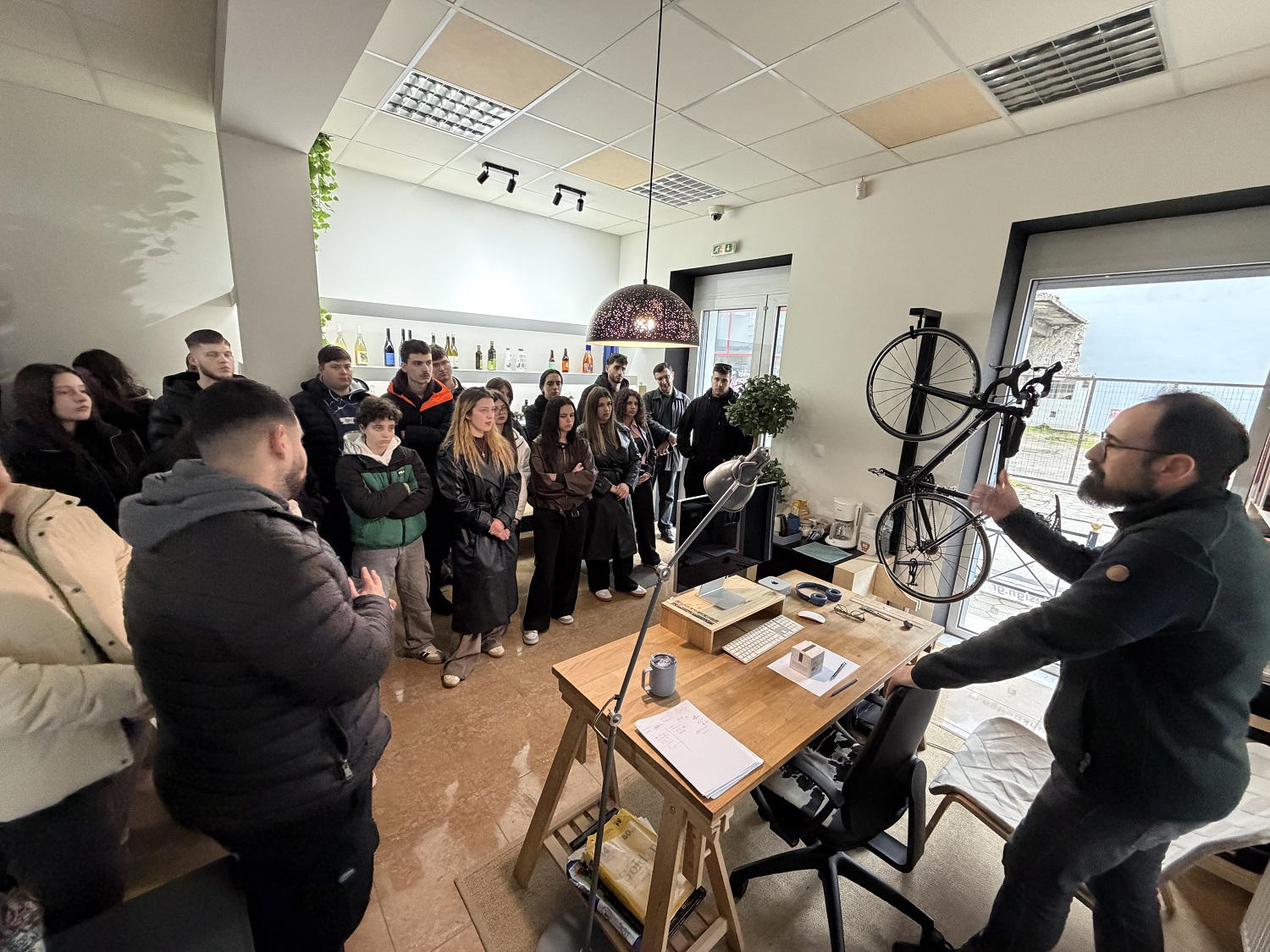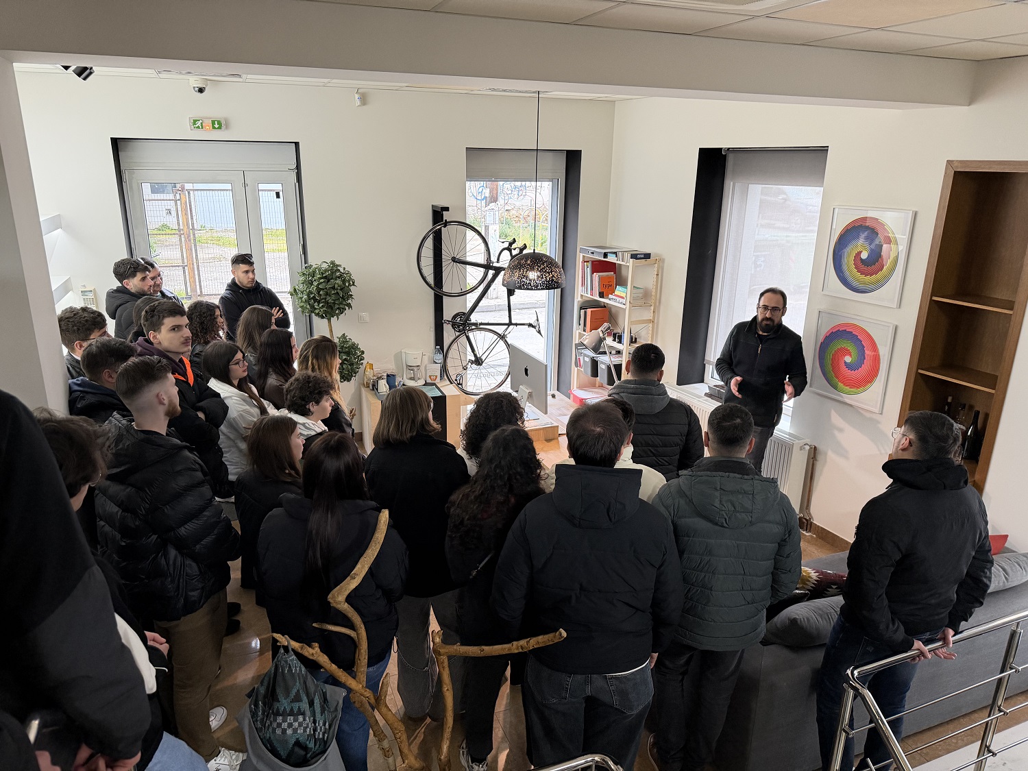 Κατά τη διάρκεια της επίσκεψης, οι συμμετέχοντες είχαν την ευκαιρία να γνωρίσουν από κοντά τη λειτουργία, τη φιλοσοφία και το όραμα του Drunk Design, ενός δυναμικού δημιουργικού γραφείου που δραστηριοποιείται στον τομέα του design, της οπτικής επικοινωνίας και της ψηφιακής δημιουργίας. Η ομάδα του γραφείου παρουσίασε αναλυτικά τον τρόπο με τον οποίο η δημιουργικότητα συνδυάζεται με τη στρατηγική σκέψη και τις νέες τεχνολογίες, με στόχο την ανάπτυξη καινοτόμων υπηρεσιών και την ενίσχυση της ανταγωνιστικότητας των επιχειρήσεων.