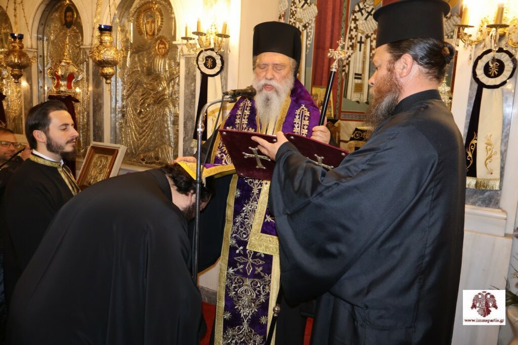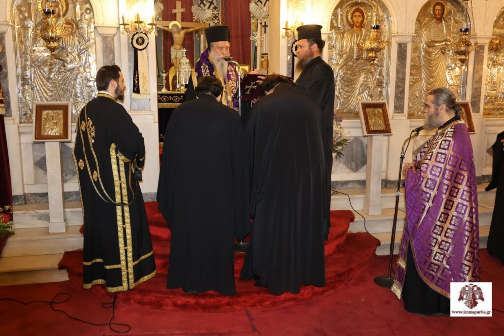 Πριν την ολοκλήρωση της ακολουθίας, πραγματοποιήθηκε η χειροθεσία εις Πνευματικούς δύο Αρχιμανδριτών, μελών της αδελφότητας της Ιεράς Μονής Αγίων Αναργύρων Πάρνωνος, του π. Λεοντίου Βαρδάκη και του π. Νικοδήμου Καρκαμπάση.