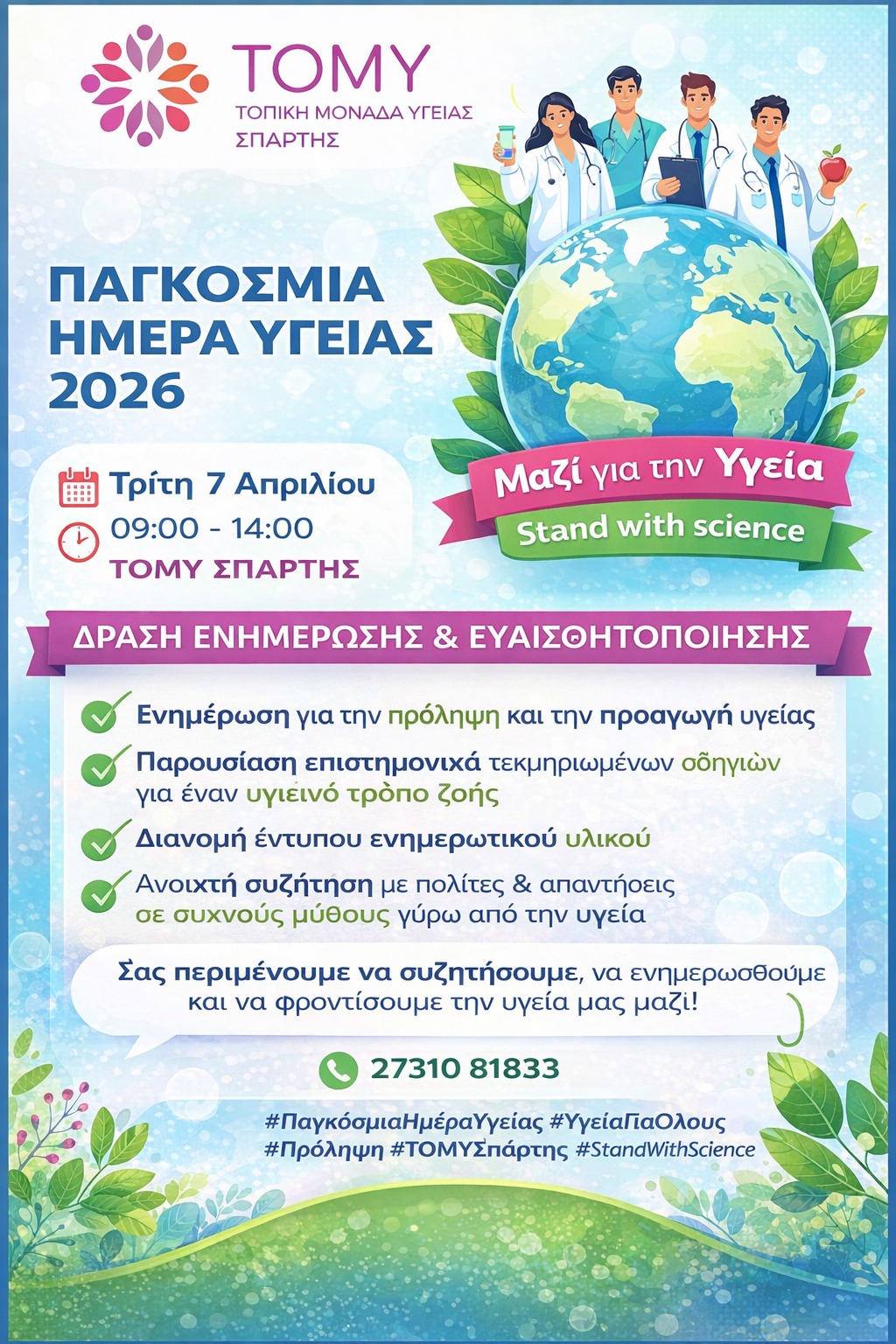 Με αφορμή την Παγκόσμια Ημέρα Υγείας 2026, η Τοπική Μονάδα Υγείας (ΤΟΜΥ) Σπάρτης διοργανώνει μια σημαντική δράση ενημέρωσης και ευαισθητοποίησης για τους πολίτες, δίνοντας έμφαση στην πρόληψη και την προαγωγή της υγείας.