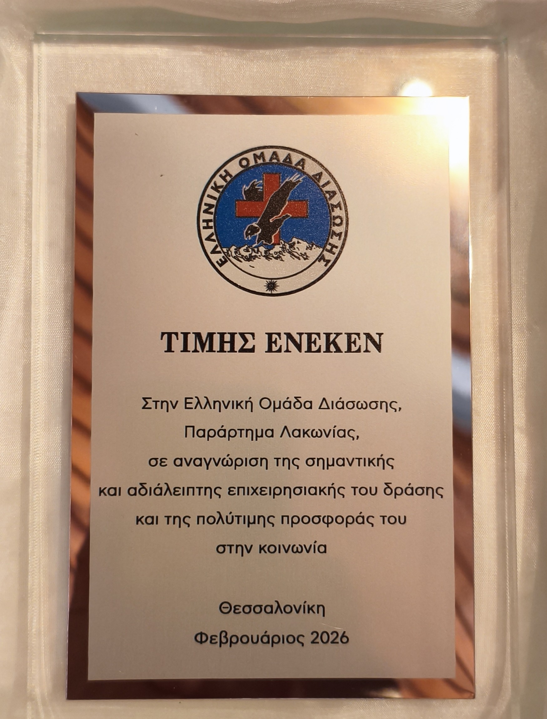 Μια σημαντική αναγνώριση για το έργο και την προσφορά της απέσπασε η Ελληνική Ομάδα Διάσωσης – Παράρτημα Λακωνίας, καθώς τιμήθηκε από την Κεντρική Διοίκηση της οργάνωσης, με έδρα τη Θεσσαλονίκη, για τη συνεχή επιχειρησιακή της δράση και τη συμβολή της στη διάσωση ανθρώπινων ζωών.