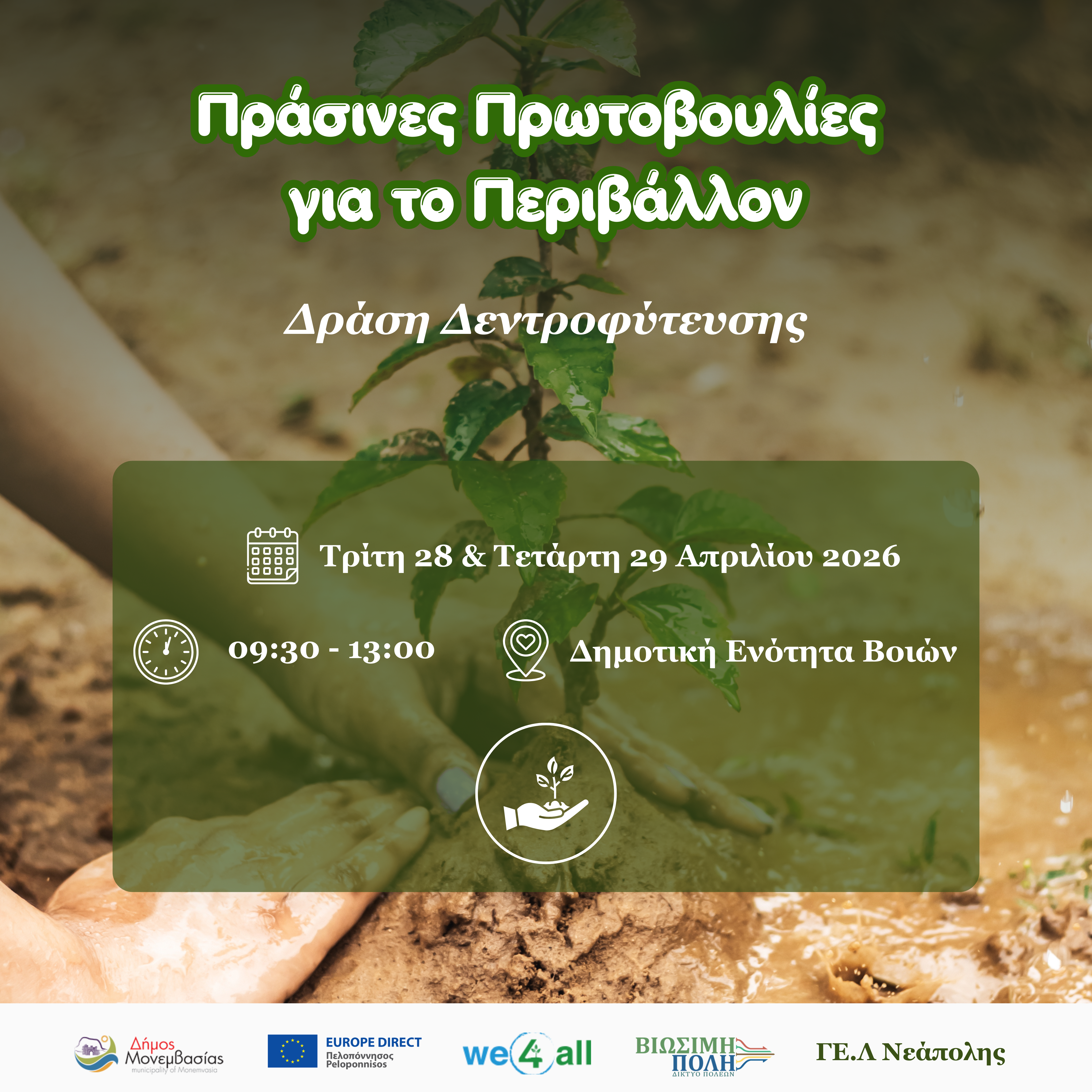 Μια σημαντική περιβαλλοντική πρωτοβουλία με ισχυρό συμβολισμό αλλά και ουσιαστικό αποτύπωμα υλοποιείται στη Δημοτική Ενότητα Βοιών, καθώς ο Δήμος Μονεμβασίας διοργανώνει διήμερη δράση δεντροφύτευσης την Τρίτη 28 και την Τετάρτη 29 Απριλίου 2026, με ώρα έναρξης τις 09:30 το πρωί.