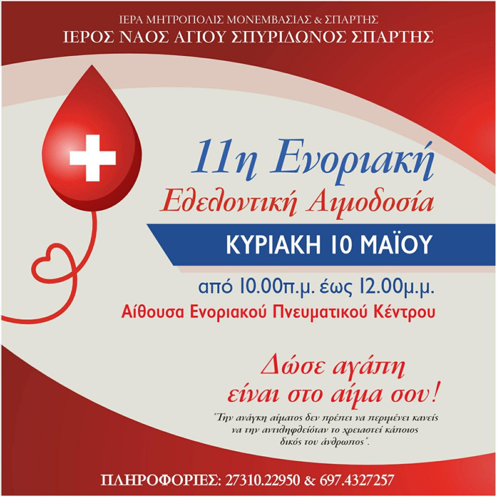Η 11η Ενοριακή Εθελοντική Αιμοδοσία του Ιερού Ναού Αγίου Σπυρίδωνος Σπάρτης θα πραγματοποιηθεί την Κυριακή 10 Μαΐου, από τις 10.00 το πρωί έως τις 12.00 το μεσημέρι, στην αίθουσα του Ενοριακού Πνευματικού Κέντρου. Πρόκειται για μια δράση που έχει πλέον καθιερωθεί, ενισχύοντας έμπρακτα το πολύτιμο έργο της εθελοντικής αιμοδοσίας και καλώντας την τοπική κοινωνία να συμμετάσχει ενεργά.