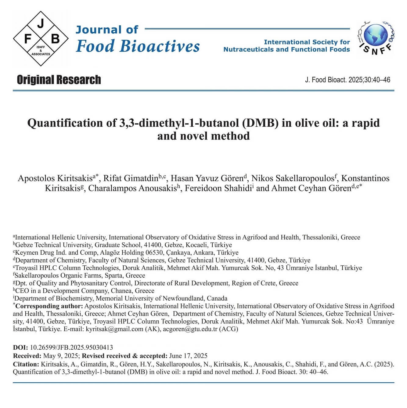 Στις 30 Ιουνίου 2025, η διεθνής επιστημονική ομάδα αποτελούμενη από 4 Έλληνες, 3 Τούρκους κι έναν Καναδό (και συγκεκριμένα τους: Rifat Gimatdin, Hasan Yavuz Gören, Νίκο Σακελλαρόπουλο, Κωνσταντίνο Κυριτσάκη, Χαράλαμπο Ανουσάκη, Fereidoon Shahidi, Ahmet Ceyhan Gören), με επικεφαλής τον Ομότιμο Καθηγητή του Διεθνούς Πανεπιστημίου Ελλάδας, Απόστολο Κυριτσάκη, δημοσίευσε στο διεθνές επιστημονικό και έγκριτο περιοδικό Βιοδραστικών Συστατικών Τροφίμων (Journal of Food Bioactives - JFB), που ανήκει στις δημοσιεύσεις της Διεθνούς Εταιρείας για τα Διατροφοφάρμακα και τα Λειτουργικά Τρόφιμα (International Society for Nutraceuticals and Functional Foods - ISNFF), τα εντυπωσιακά αποτελέσματα της πρωτοποριακής μελέτης υπό τον γενικό τίτλο «Quantification of 3,3-dimethyl-1-butanol (DMB) in olive oil: a rapid and novel method».