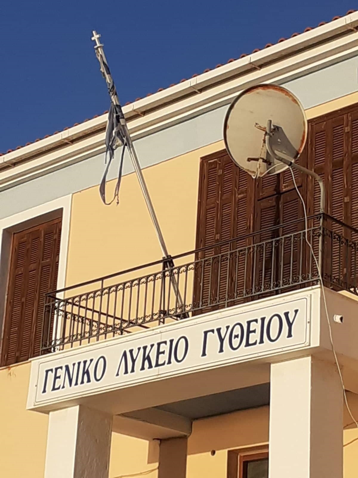 Περπατώντας στην παραλία του Γυθείου κι αντικρίζοντας το κτίριο του Γενικού Λυκείου της πόλης, το βλέμμα «πέφτει» στην ελληνική σημαία που βρίσκεται αναρτημένη πάνω από την πύλη, όμως δεν… διακρίνεται για την «αρτιμέλειά» της.